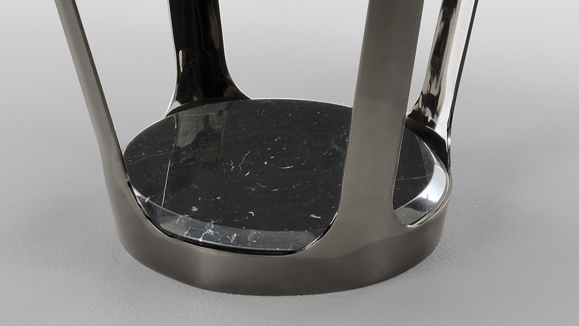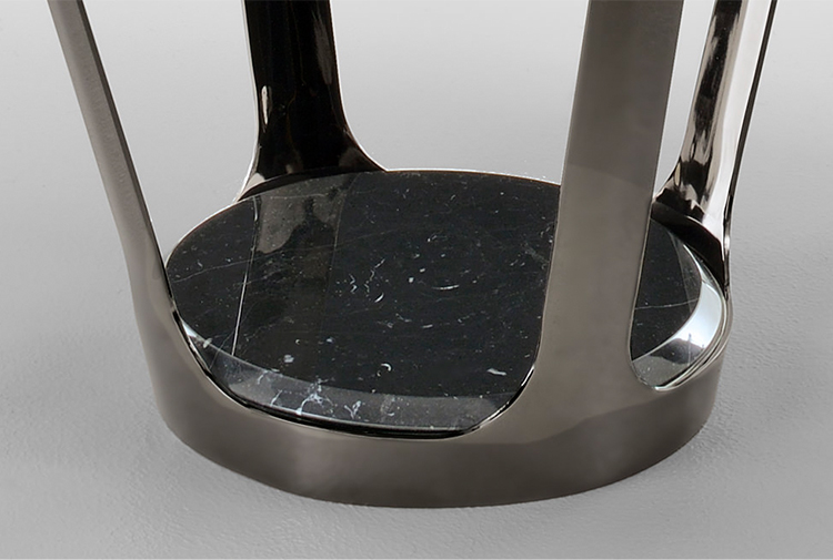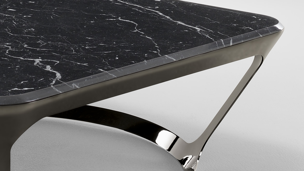 皮埃尔咖啡和侧桌的特点是整体的顶部和框架在减少的厚度。它们有一个外部金属“皮肤”,有大的开放表面和深灰色的表面。这种轻盈,加上稳定性,在表面上很明显,似乎漂浮着,有复杂的地面细节,都是缎质玻璃和珍贵的大理石。