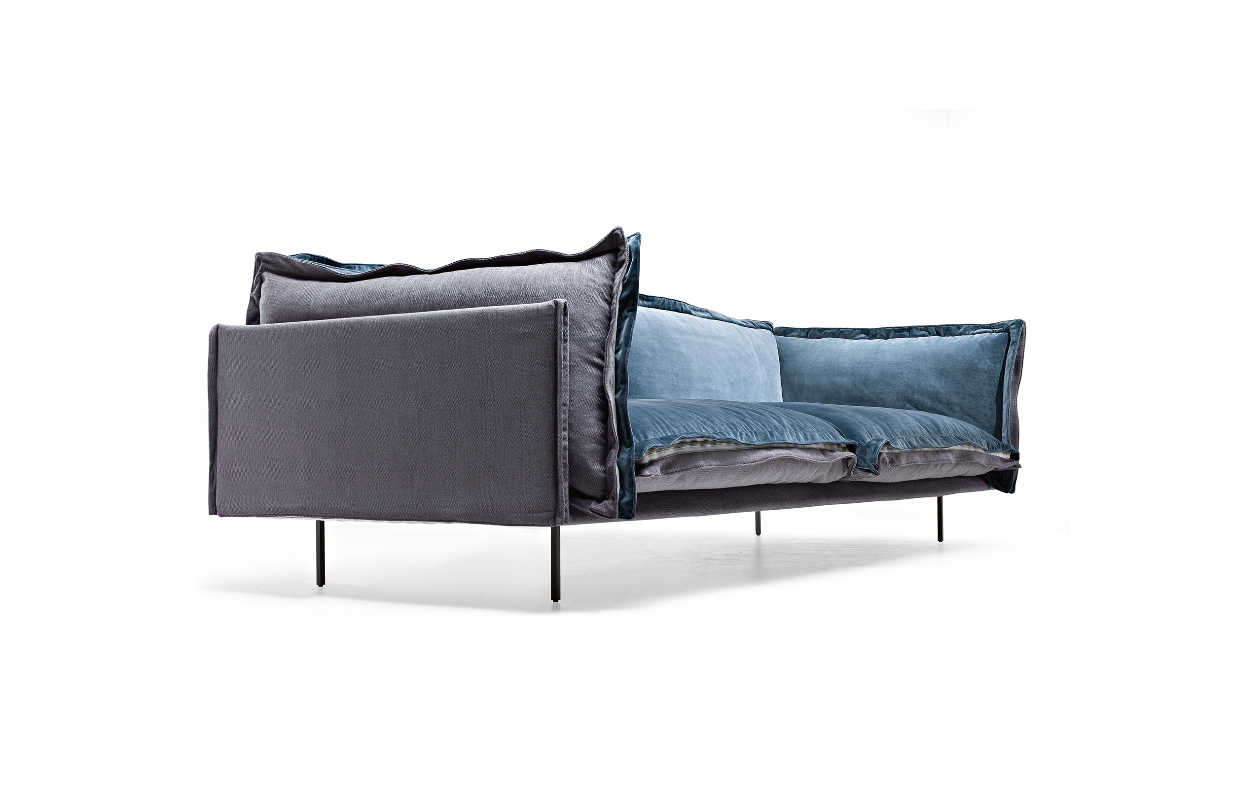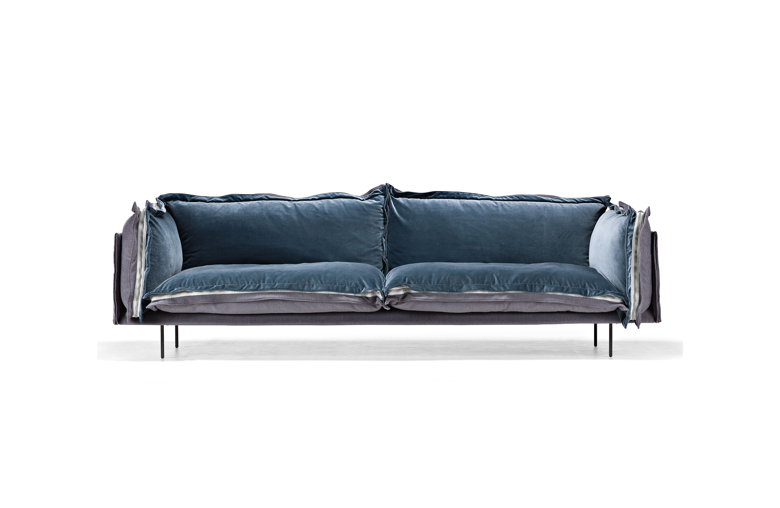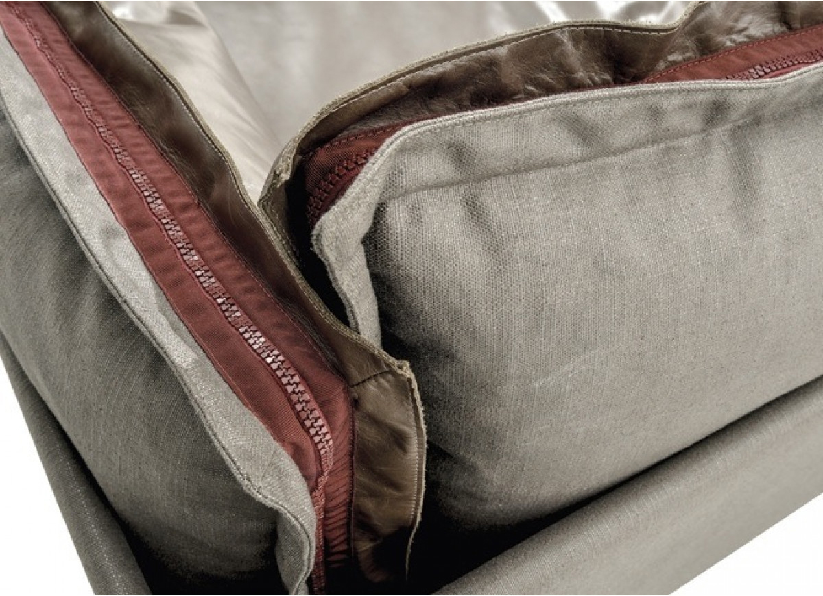 The important zip, applied to the four sides of the cushions, fastens the two-sided cover, one in leather and one in fabric, gives rigour to the sofa and underlines its peculiar design. The result is a sofa in which the softness and warmth of the fabric coexists with the elegance of leather. A peculiar mix of materials to create different chromatic combinations and sophisticated matches. The structure seems to float above the ground thanks to the thin, minimal feet made of square section metal.