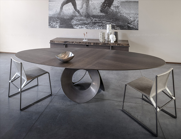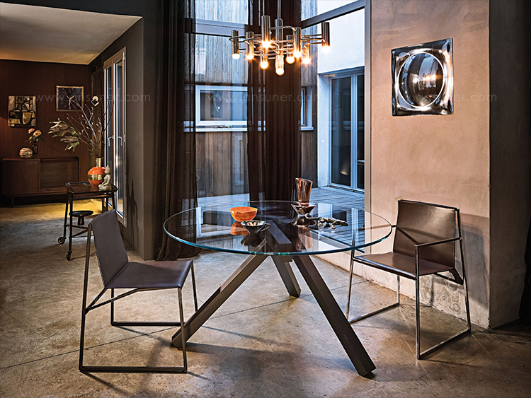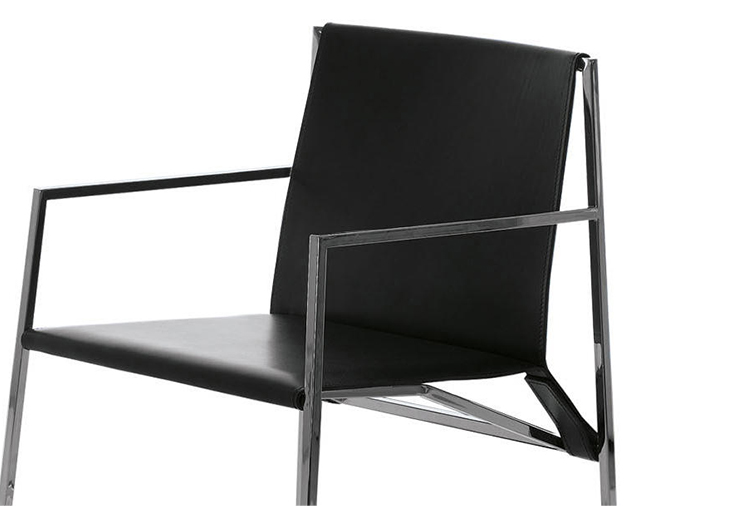 几何和简约的线条勾勒出了这种朴素典雅的椅子。这种金属结构,在抛光铬、云母棕或氧化灰色中都有,而且座椅和靠背可以用人造革或皮革制成,这是一件奢华而又谨慎的作品,适合周围的每一个人。