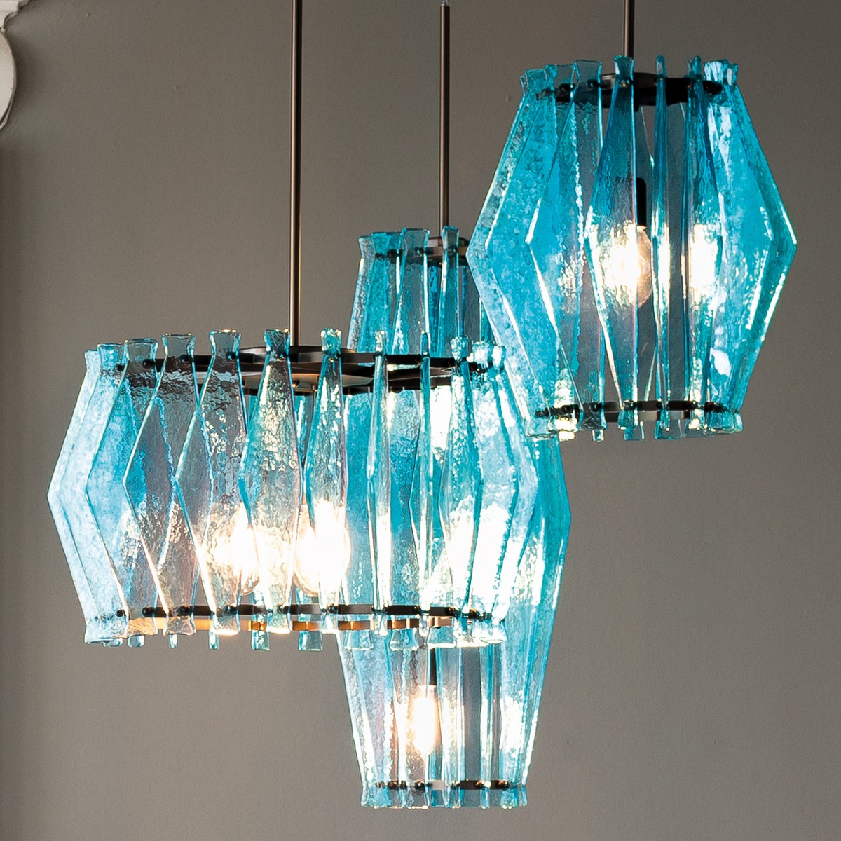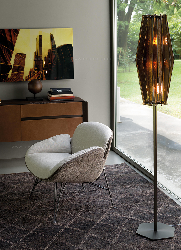 oompa-loompa灯的特点是有几条带着径向定位的带斑点的玻璃,就像许多小型的“oompa-loompas”正在跳舞一样。光线透过玻璃和空的空间扩散,创造出几束光线,营造出壮观的环境。该系列包括一个悬挂的版本,有青铜色、蓝绿色和红宝石色三种不同颜色;和一盏落地灯。金属部分是云母棕色的钛。