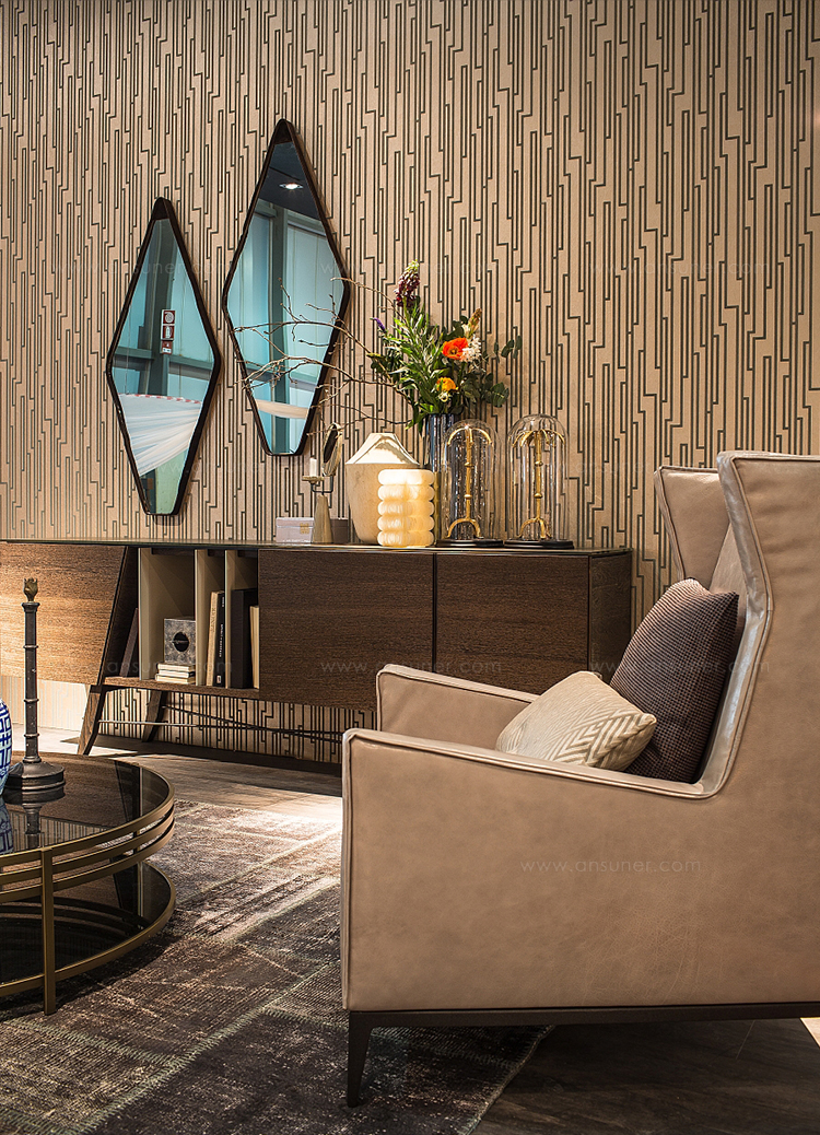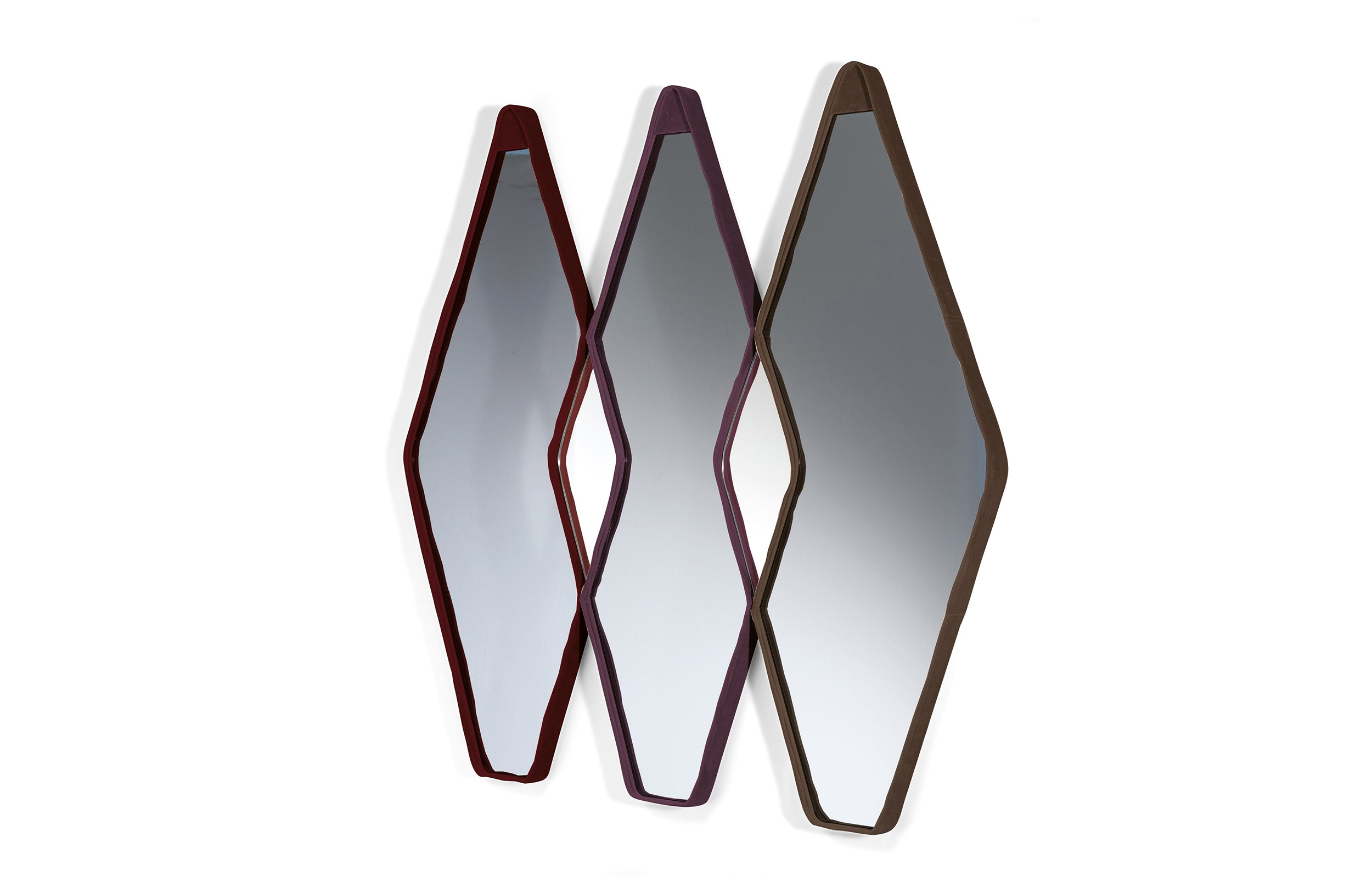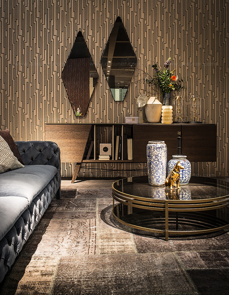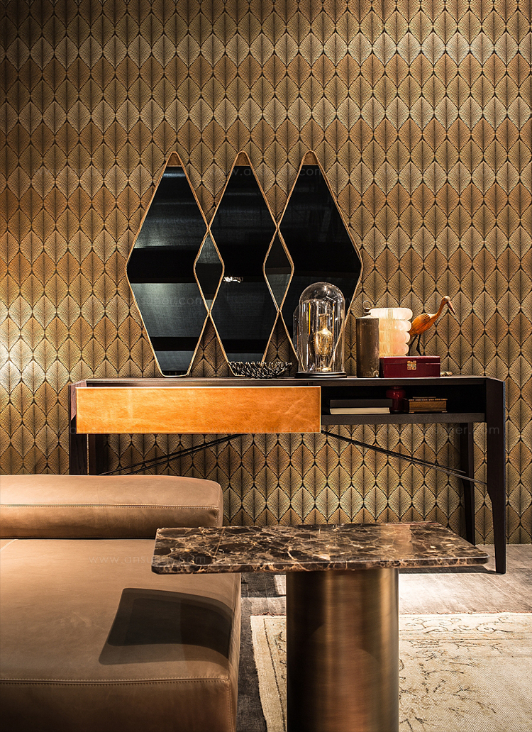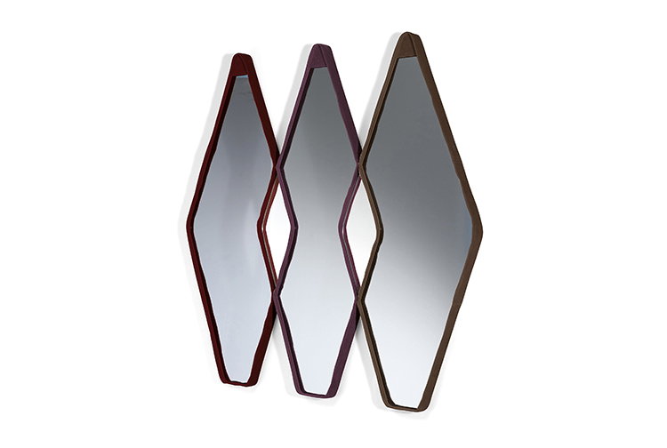 Gino Carollo设计的《名利场》(Vanity Fair)由镜子或烟熏玻璃制成。它以丝绒或皮革制成罩盖提供了一种严谨的精度和美感的效果,并与简单的菱形线形成对比。镜子可以是单、双、三、甚至是将模块并排放置在墙上。