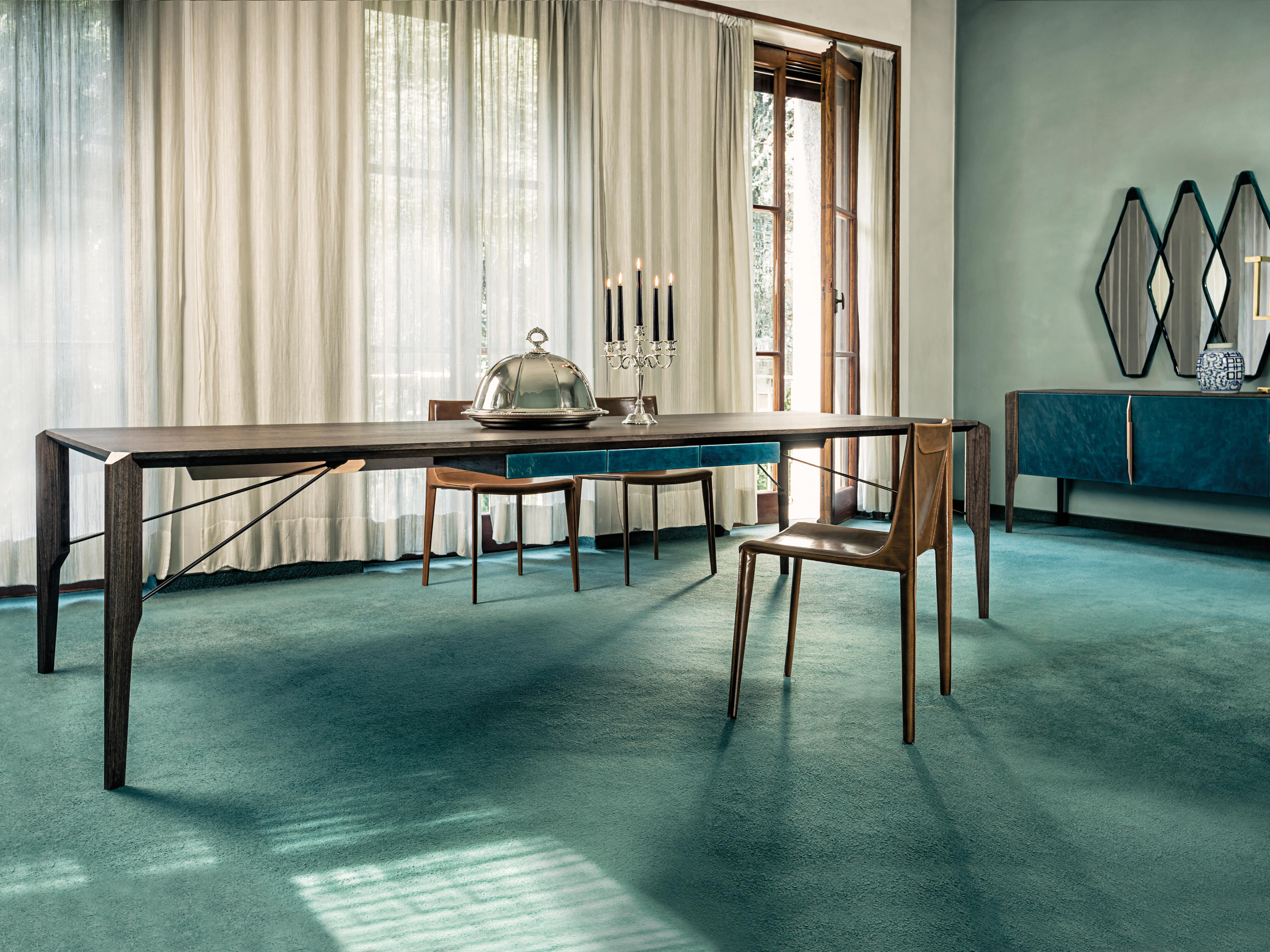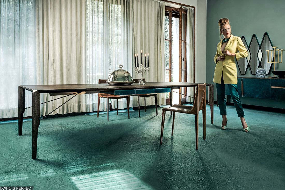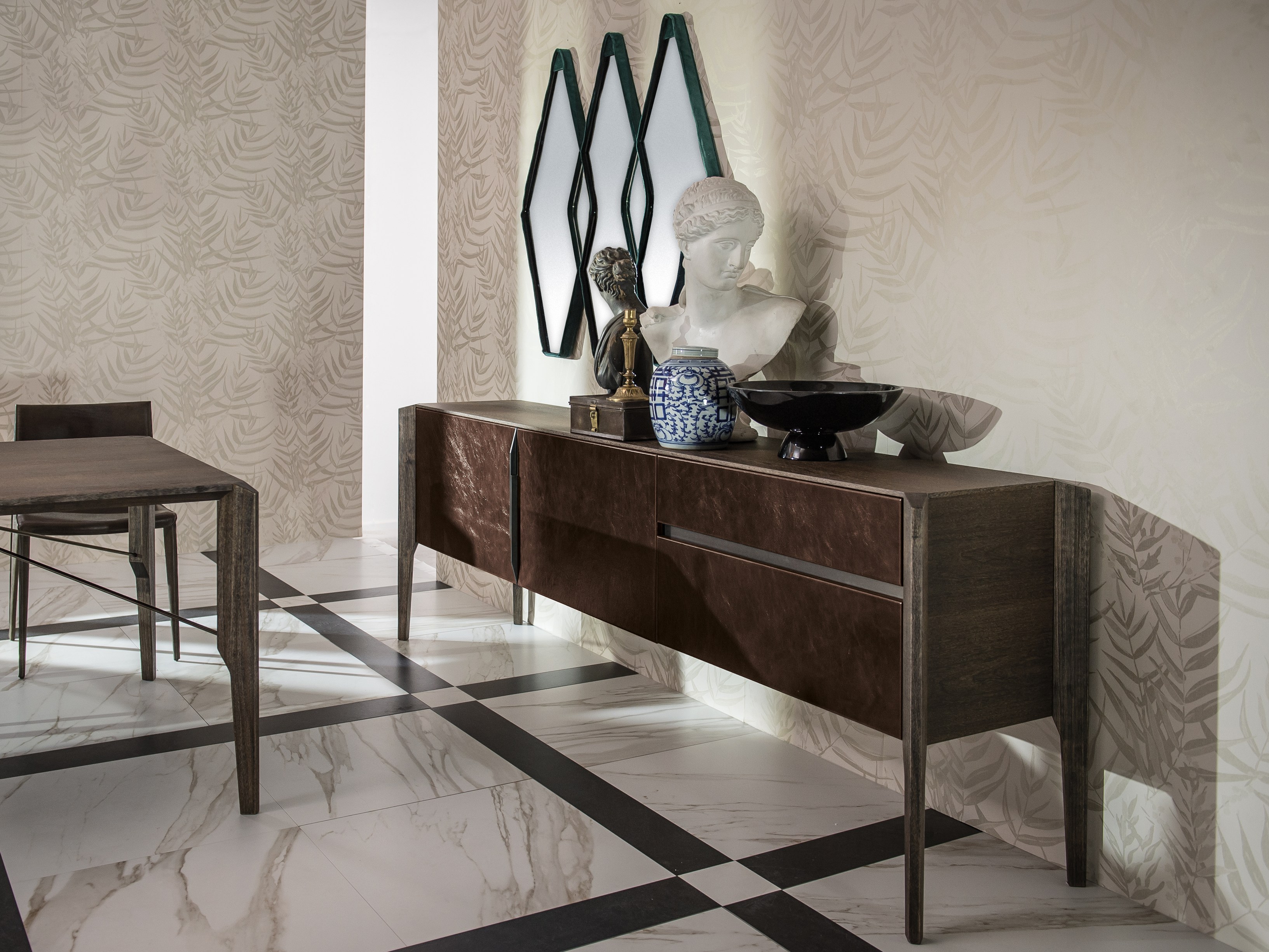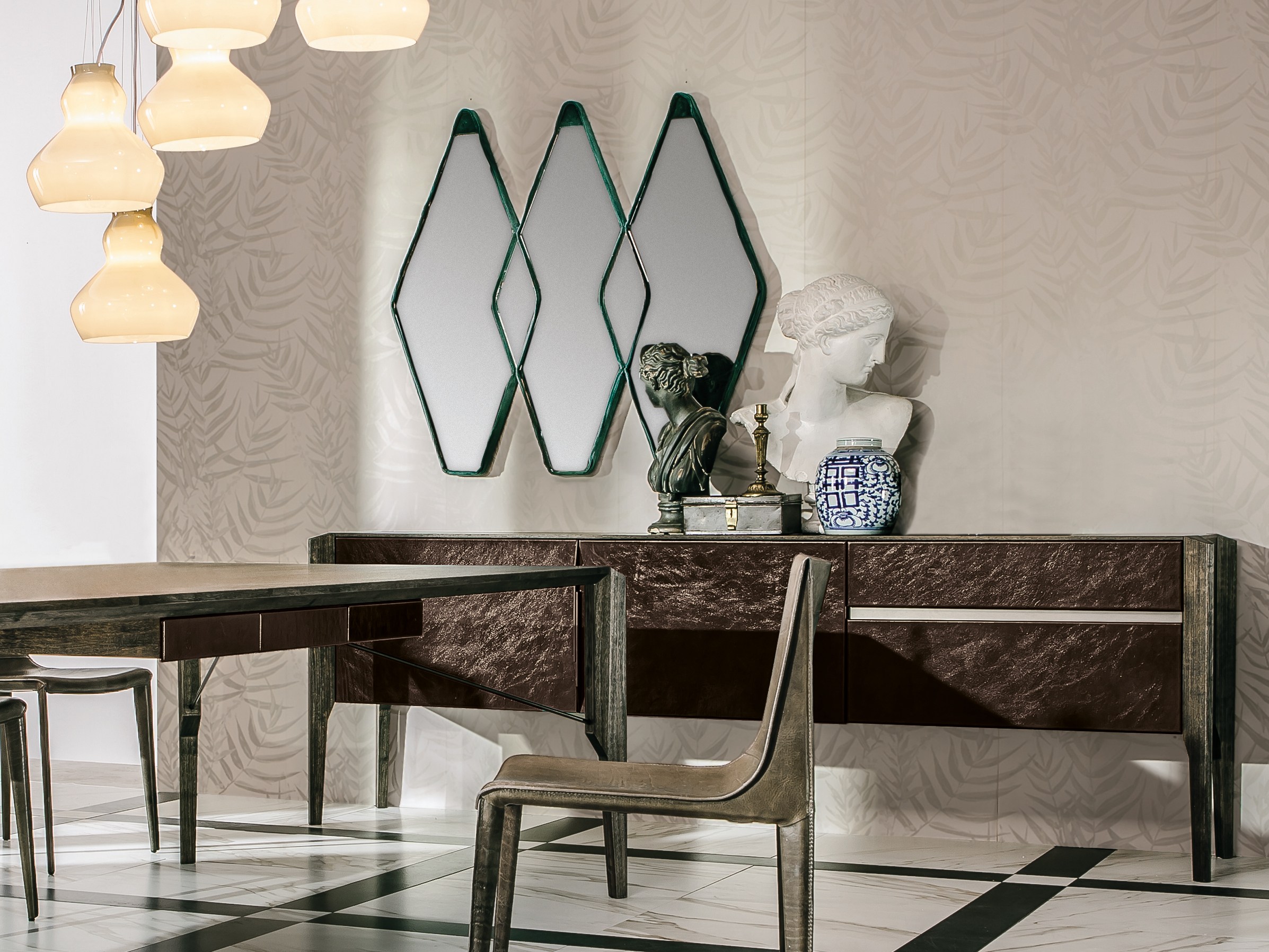 Gino Carollo设计的《名利场》(Vanity Fair)由镜子或烟熏玻璃制成。它以丝绒或皮革制成罩盖提供了一种严谨的精度和美感的效果,并与简单的菱形线形成对比。镜子可以是单、双、三、甚至是将模块并排放置在墙上。