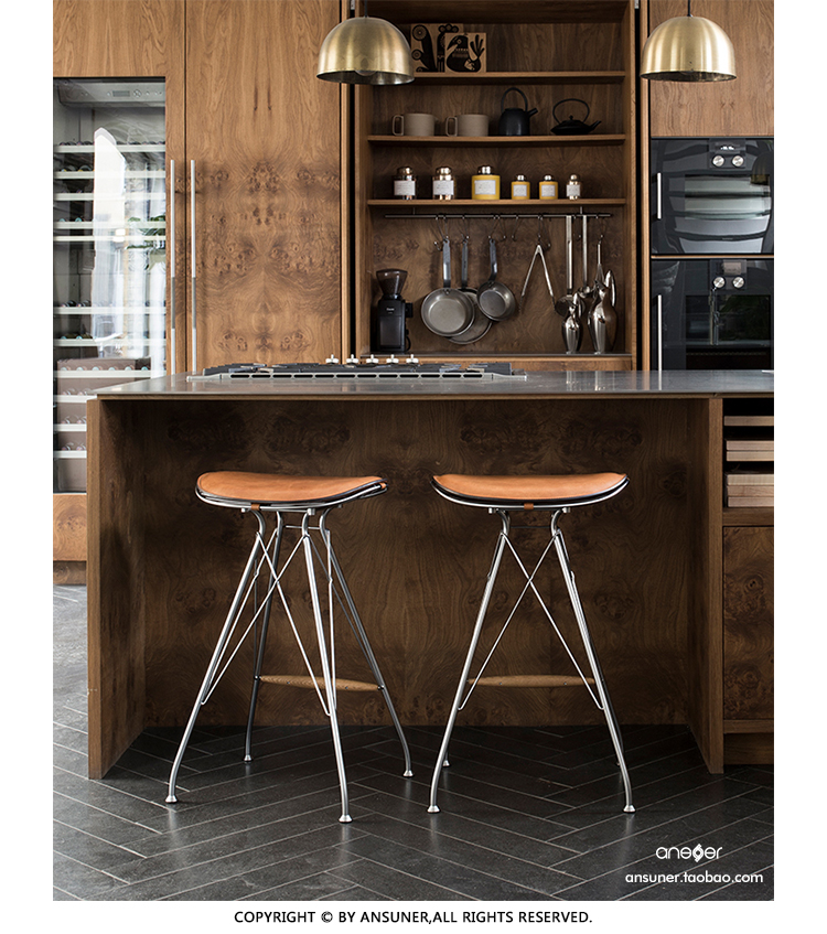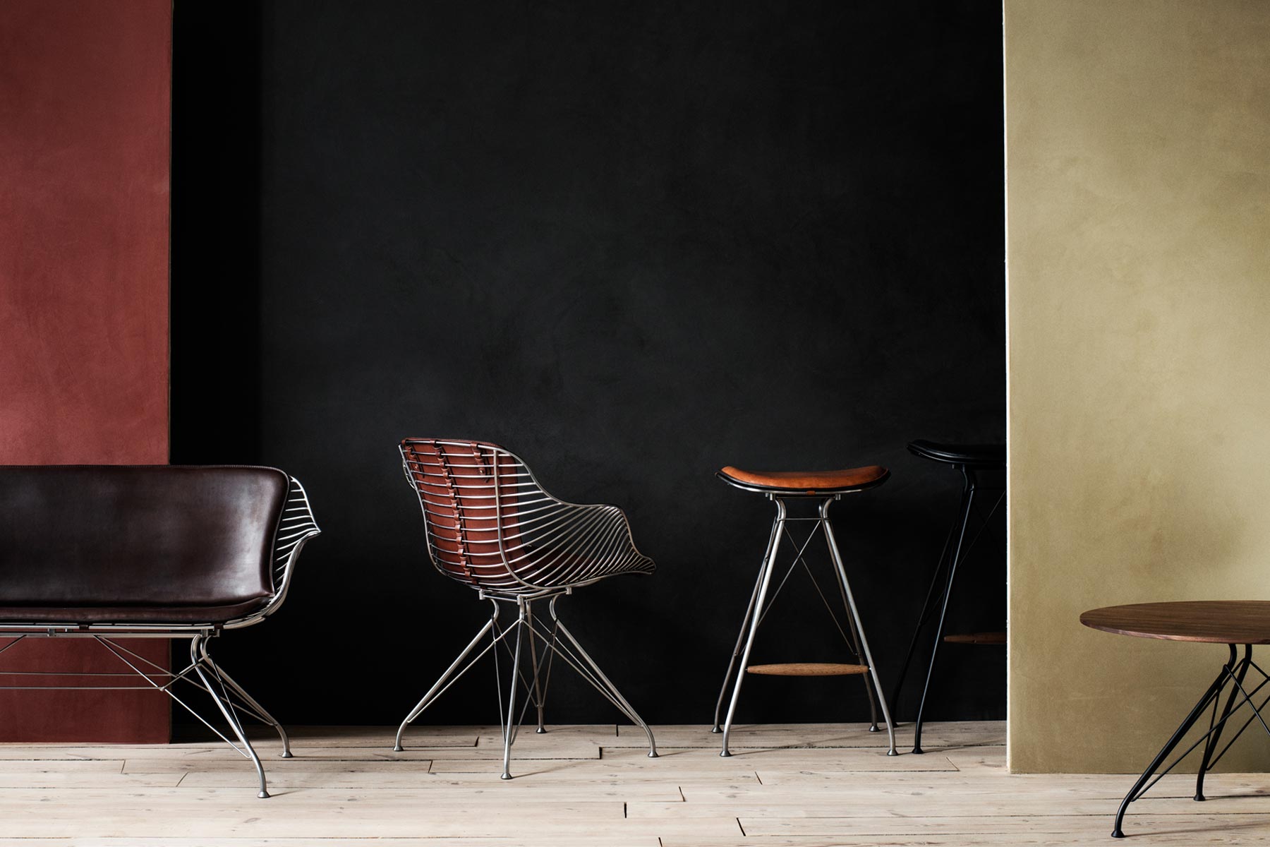 金属丝吧椅由Jasper Overgaard和Christian Dyrman设计。2014年设计的金属丝躺椅是一种更低、更宽、更平放的版本,与铁丝餐椅相比。