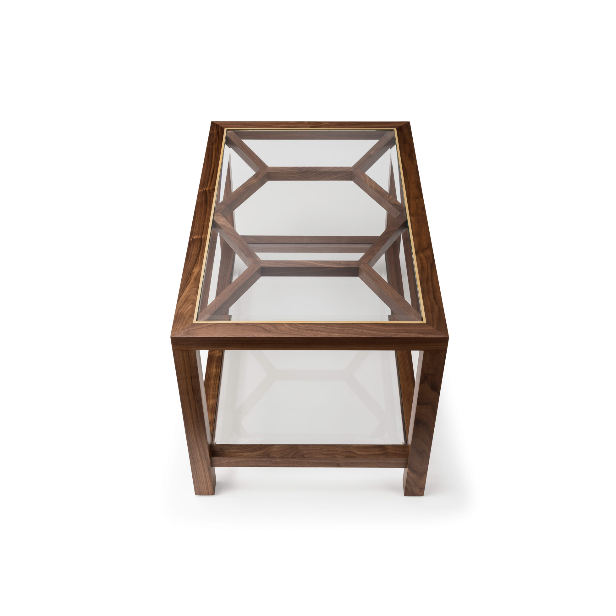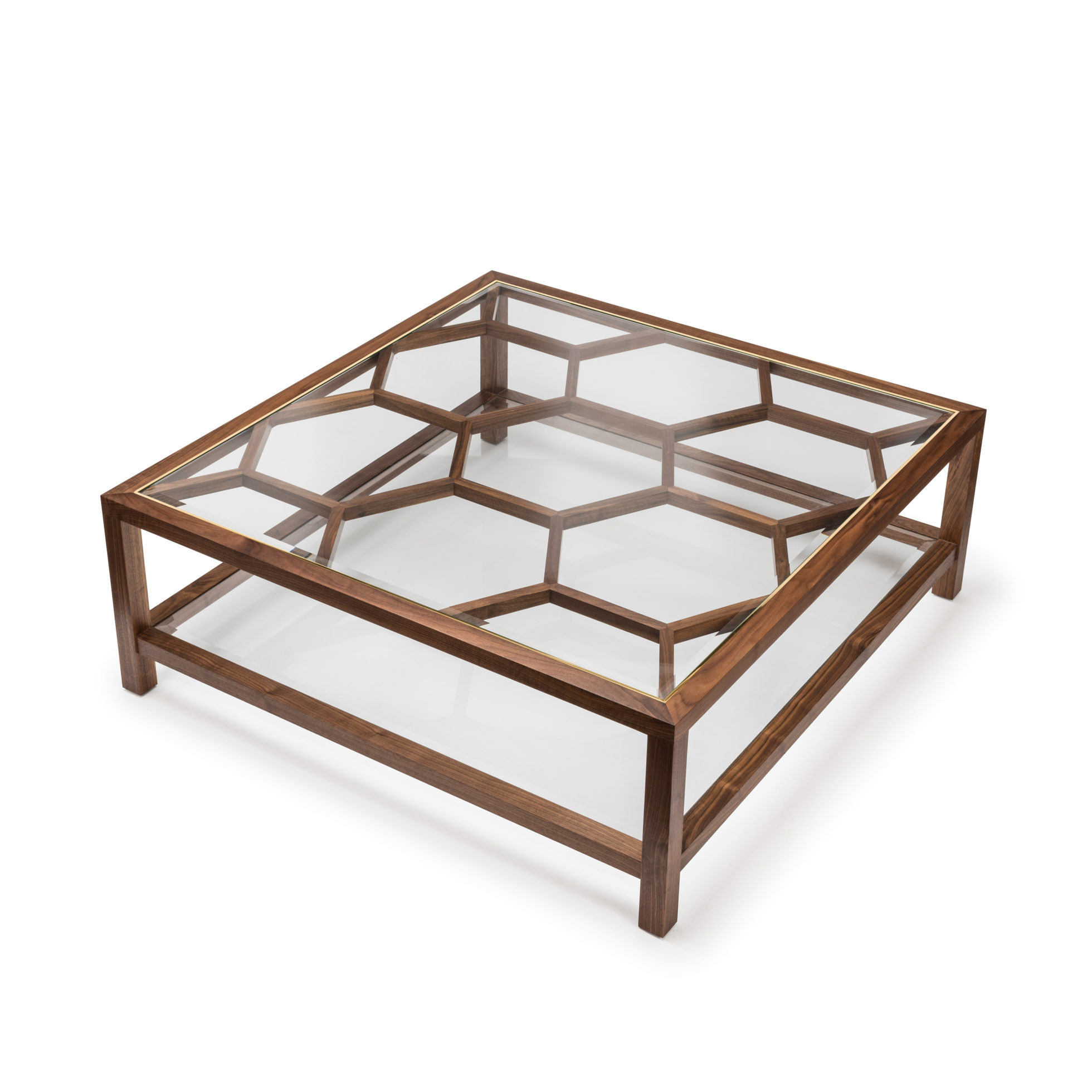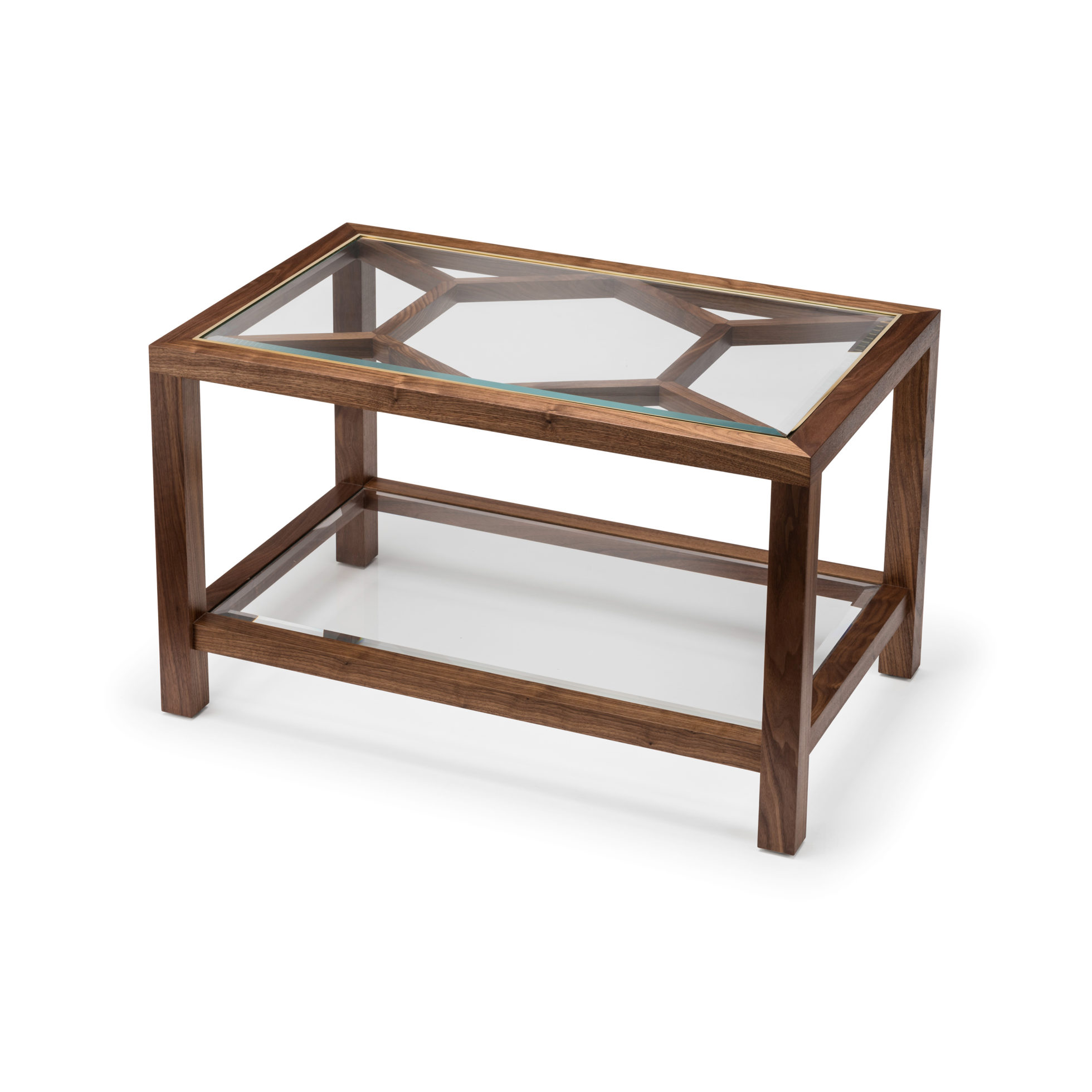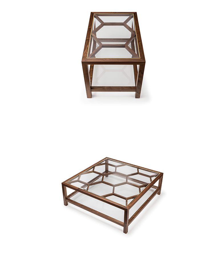 Expressing pattern beautifully, our Archebee Side Table is hand constructed of solid American black walnut and beveled glass with metal detailing. Its inherent strength and delicate form arises from where the beautiful rudiments of geometric form meet natural materials.