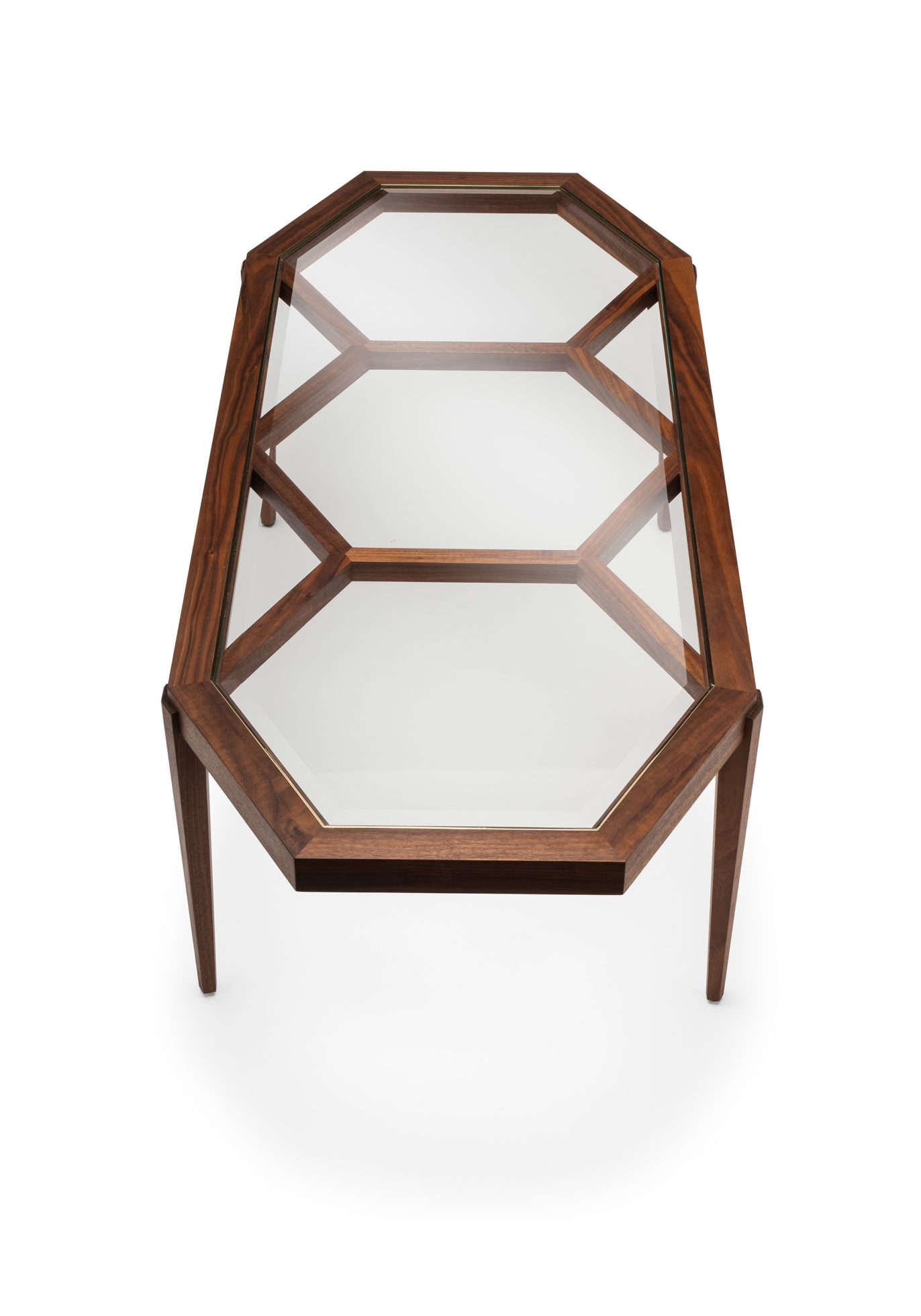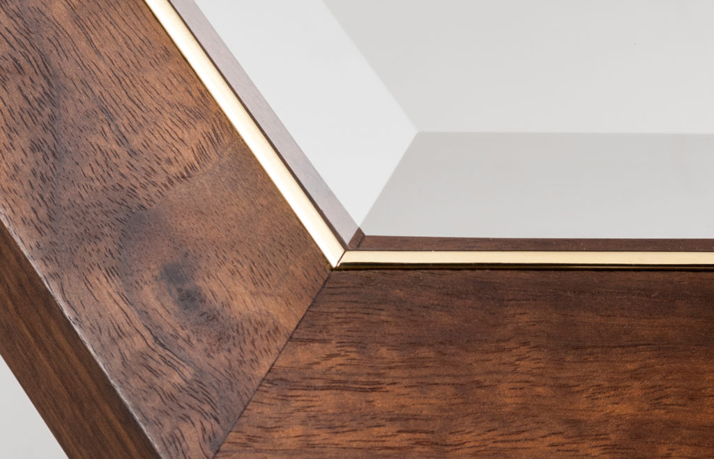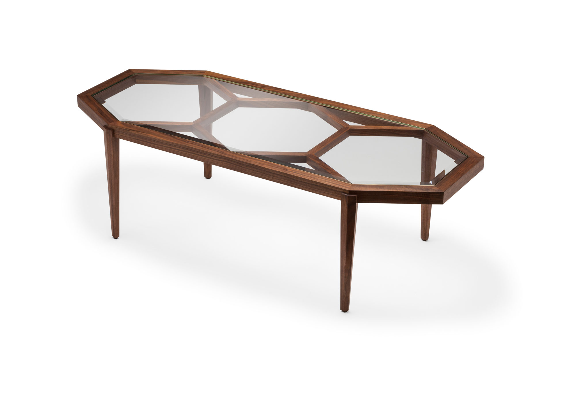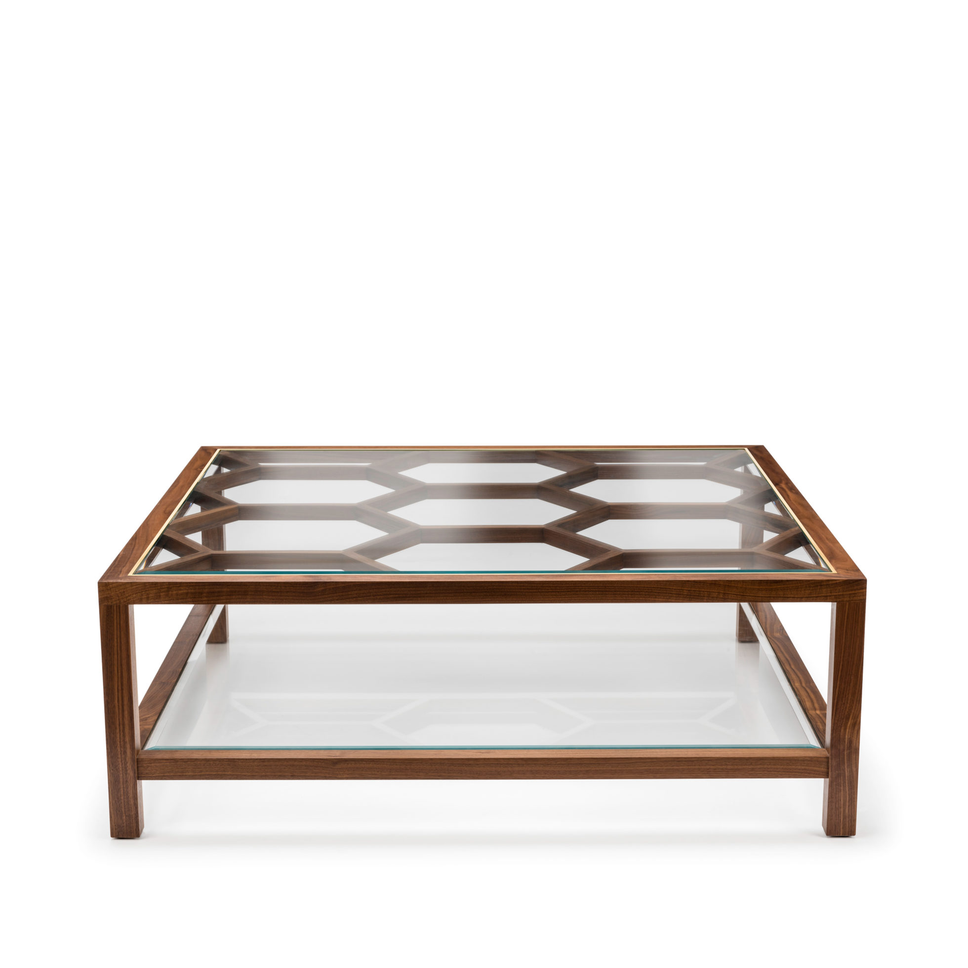 Expressing pattern beautifully, our Archebee Side Table is hand constructed of solid American black walnut and beveled glass with metal detailing. Its inherent strength and delicate form arises from where the beautiful rudiments of geometric form meet natural materials.