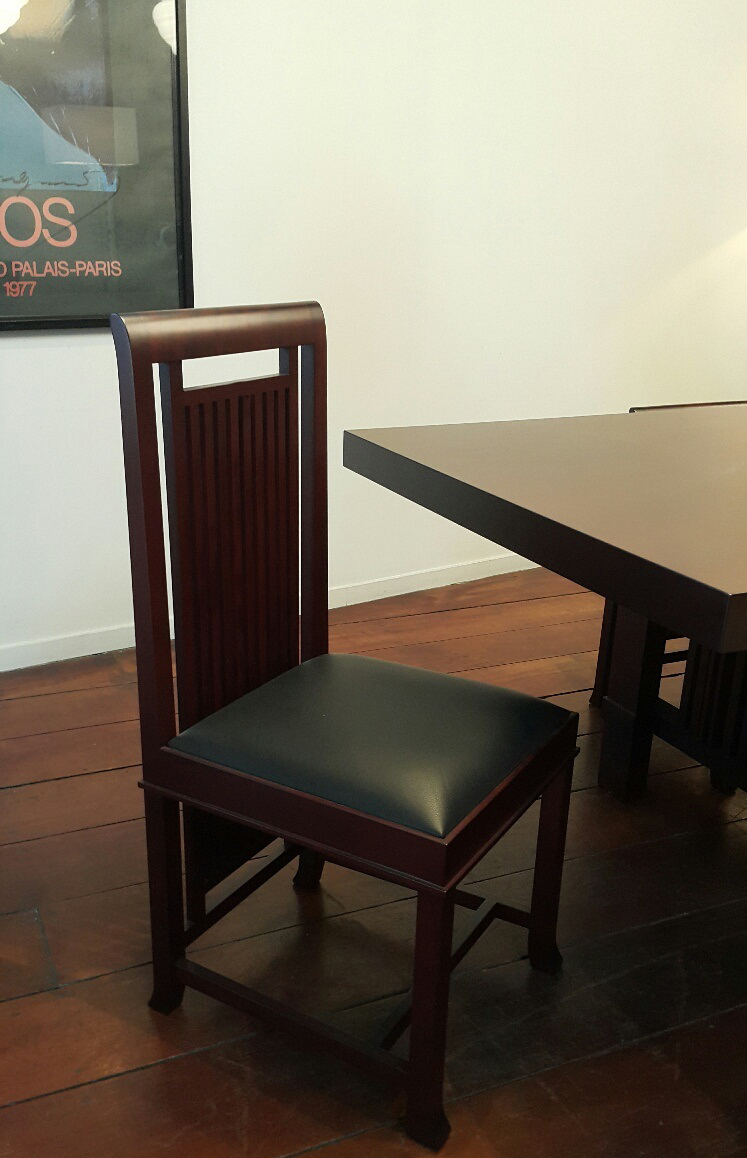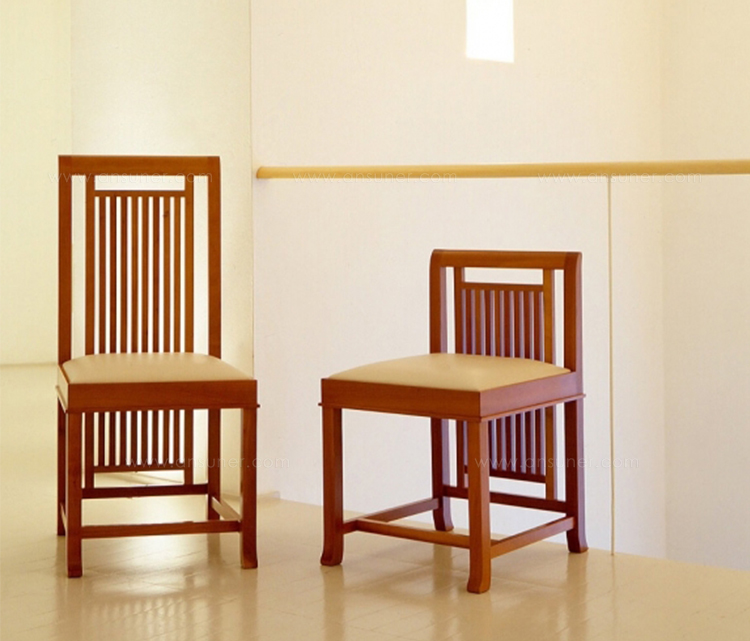 靠背椅,采用天然樱桃木、樱桃木色或黑色胡桃木制造。座垫采用聚氨酯海绵填充,皮革及布艺面料软包。