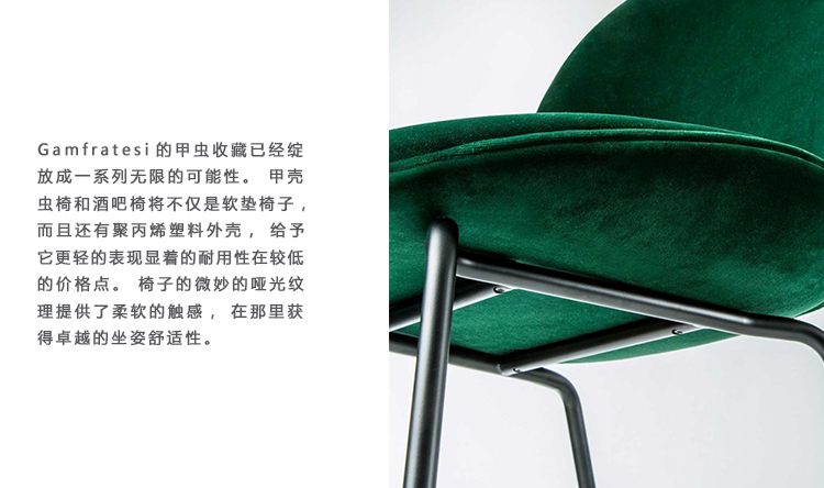 由于GamFratesi一直密切关注甲虫的解剖学,美学和运动,因此在昆虫世界中发现了甲壳虫椅的灵感。 椅子的设计重新诠释了甲虫部分的特征元素:形状,贝壳,缝合线,刚性外部和柔软的内部。