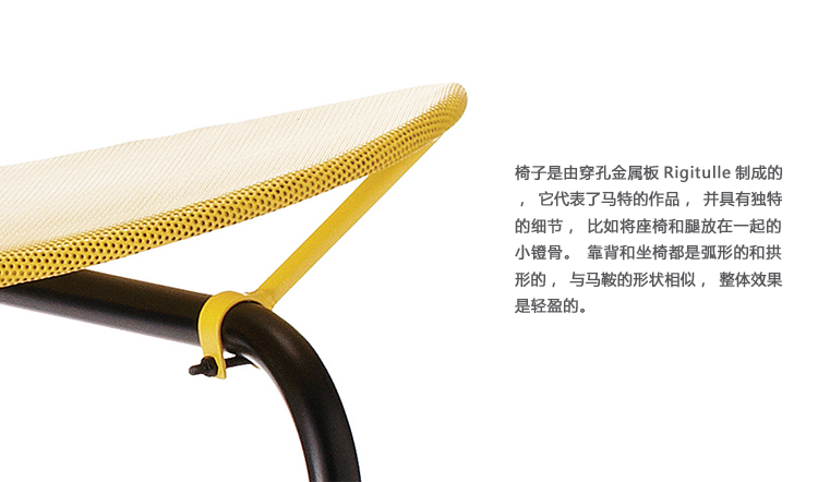 模型。椅子是由穿孔金属板Rigitulle制成的,它代表了马特的作品,并具有独特的细节,比如将座椅和腿放在一起的小镫骨。靠背和坐椅都是弧形的和拱形的,与马鞍的形状相似,整体效果是轻盈的。高度平面设计的设计唤起了勒·柯布西耶在龙尚教堂的工作。今天,椅子是永久性收藏的一部分,在国际著名的私人维特拉设计博物馆。