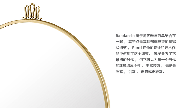 Gio Ponti的标志性设计之一是1925年的Randaccio镜子。在米兰的Via Randaccio为他自己的家设计,这是他的第一个建筑项目,Randaccio镜面装饰了他三楼卧室的墙壁和其他专为公寓设计的家具。Randaccio镜子将优雅与简单结合在一起,其特点是其顶部非典型的皇冠状细节,Ponti在他的设计和艺术作品中使用了这个细节。镜子参考了它最初的时代,但它可以为每一个当代的环境增添个性,丰富装饰,无论是卧室,浴室,走廊或更衣室。