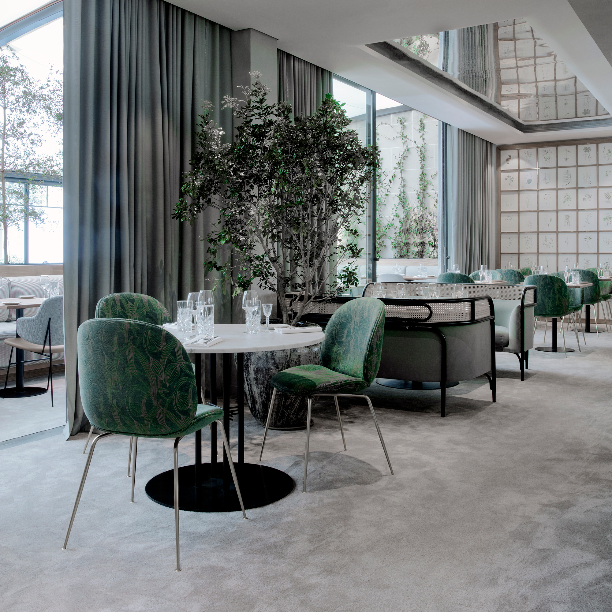 TS圆柱餐桌三个高度,其特征是细长的金属腿和交叉细节,统一到中心柱,专为巴黎Maison du Danemark的Flora Danica餐厅设计的装饰桌。 作为这个宏伟的空间,桌子代表了斯堪的纳维亚极简主义与全球优雅。 TS Column Table为私密用餐,社交和氛围氛围设定了框架,重点放在真实的材料选择和精心制作的工艺上。