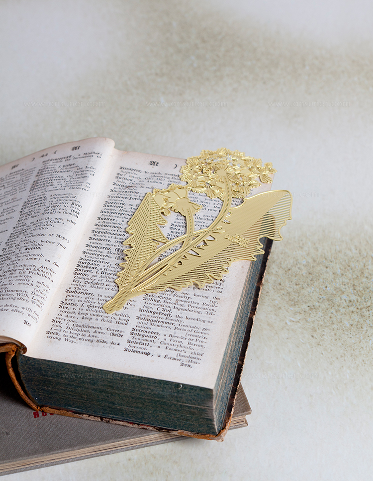 一个灵感来自大自然的书签和长期被遗忘的压花,往往落在一本备受喜爱的书的页面上。 工具蒲公英采用微观细节制造,从黄铜板精密蚀刻,创造出这种精致的花朵。 还有羽毛笔,钢笔,手形指针,明信片和放大镜。