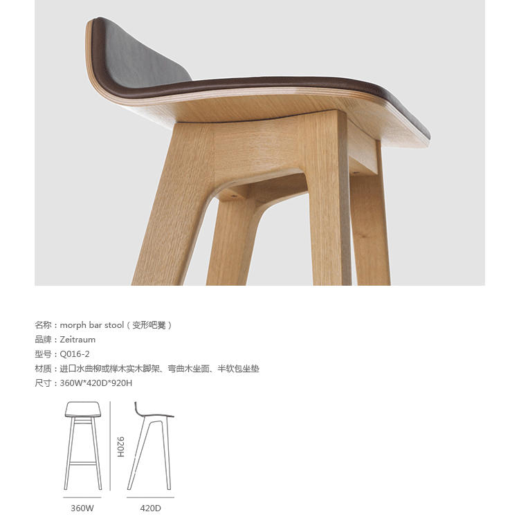 德国家具厂牌 ZEITRAUM 讲究的不仅仅是家具,它着重的是一种"生活态度",每件 ZEITRAUM 家具除了需具备实用、耐用、容易搭配的基本要件,更重要的是可以衬托用户与空间的个性,简约取代夸张花俏的线调,细腻精巧的做工低调传递设计师缜密的设计思维。ZEITRAUM 使用来自永续森林的落叶型硬木,表面以有机油/蜡涂装,完全不使用化学物质,让用户与家具在空间自由呼吸。Morph bar stool(变形吧凳)由丹麦设计工作室Formstelle设计,弯曲的弧线漂亮的惊讶,本以为这随性的木设计又来自丹麦,想不到却是来自严谨的德国。丹麦设计的影响力可见一般。如果放在现代的环境中还是复古的空间里,都是非常漂亮的家具。坐感非常的贴合人体工学,其木材的拉丝设计脱颖而出。