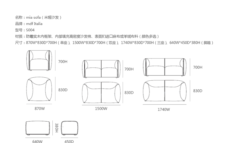Mia是著名设计师Francesco Bettoni为MDF Italia公司设计的沙发系列,是紧凑、柔软、舒适的扶手沙发。外型以简约细腻的北欧设计为方向,蓬松的椅座内衬泡棉外覆仿羽绒质感纤维,貌似棉花糖亲切可人,同时舒适感满分。视觉比例的层迭丰富,融合义式沙发中柔软舒适的元素,靠垫内衬高密度泡棉,表层外覆羽绒,兼具支撑性与松软度,简约、古典、魅力四射。