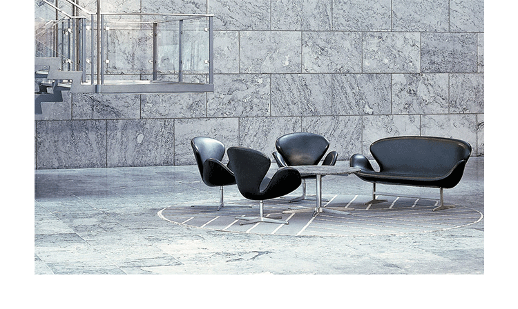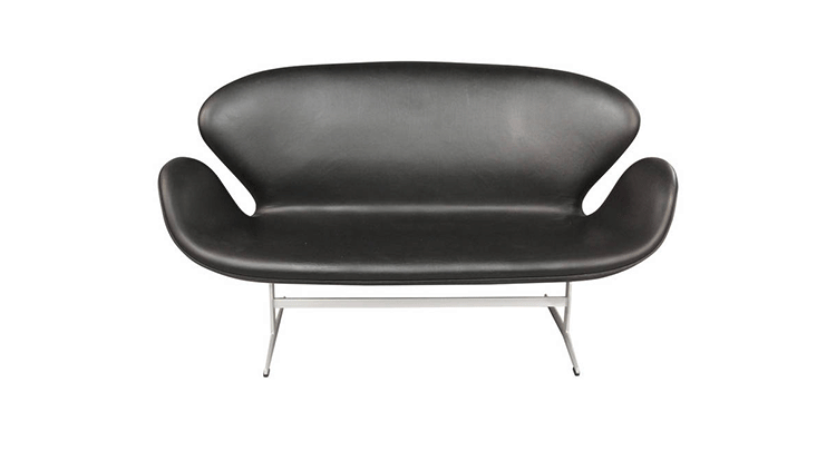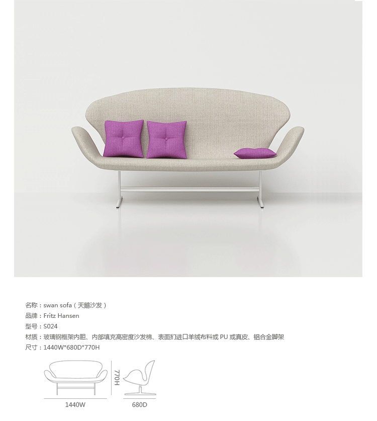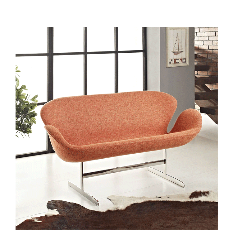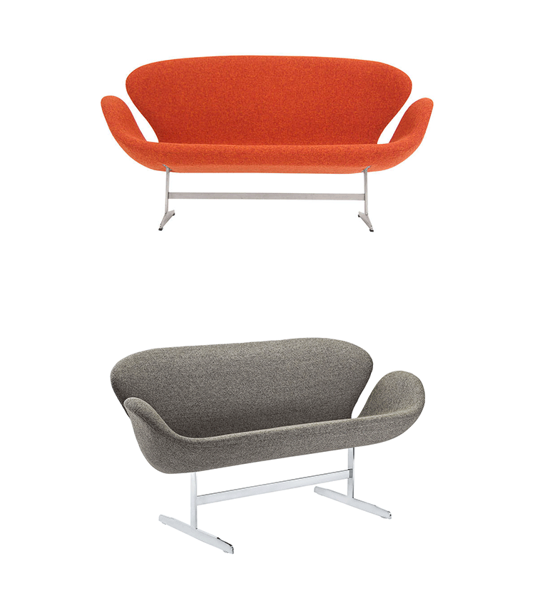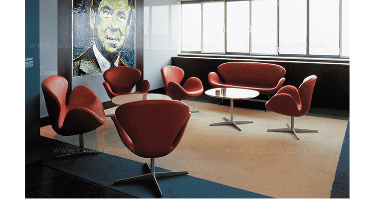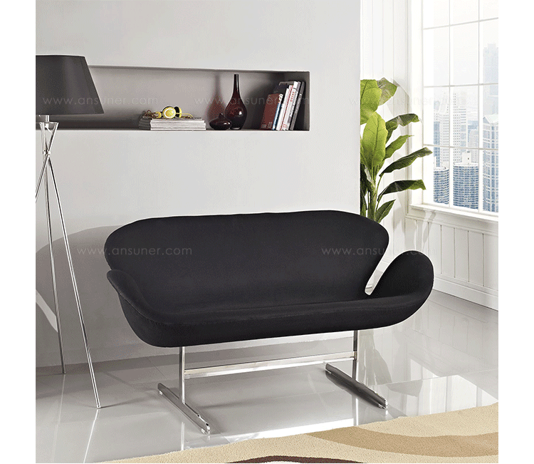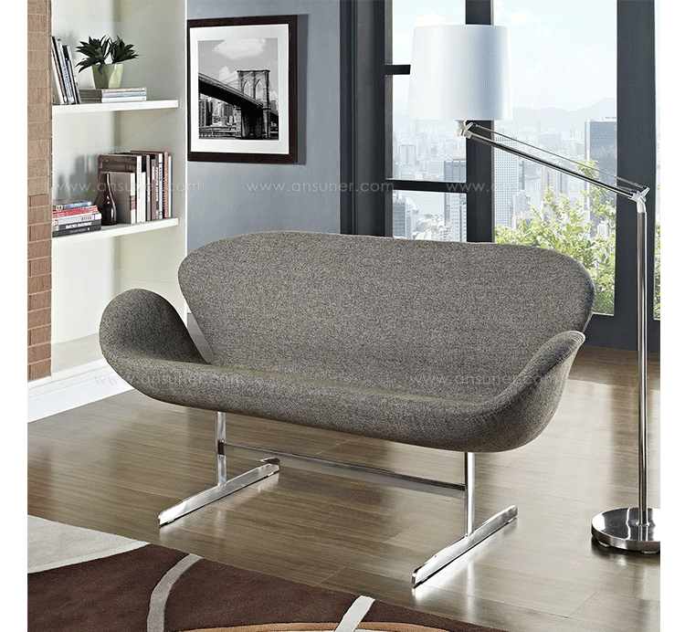 1958 年,Arne Jacobsen为哥本哈根皇家大酒店21楼房间的套房、 休息室和全景房设计的这套Swan Sofa(天鹅沙发)。天鹅沙发是两个坐席版本的天鹅椅,这个优雅的沙发设置在铝振动筛脚架上。优雅的和有机的形状非常适合休息室和等候区,以及家庭。雅各布森作为一个著名建筑师,同时也是一位非常成功的工业设计师,他为丹麦著名的FH家具公司〔FritzHansen〕设计了一系列座具家具,都成为市场欢迎的畅销产品。他的家具设计作品都是享誉国际的经典设计,天鹅椅就是其中之一;他将自由流畅的雕刻式塑形,以及北欧设计的传统特质相结合,使其作品具有质感非凡与结构完整的特点。天鹅椅制作采用玻璃钢框架内胆、内部填充高密度沙发棉、表面扪高级进口羊绒布料或PU或真皮、铝合金脚架(可振动)。