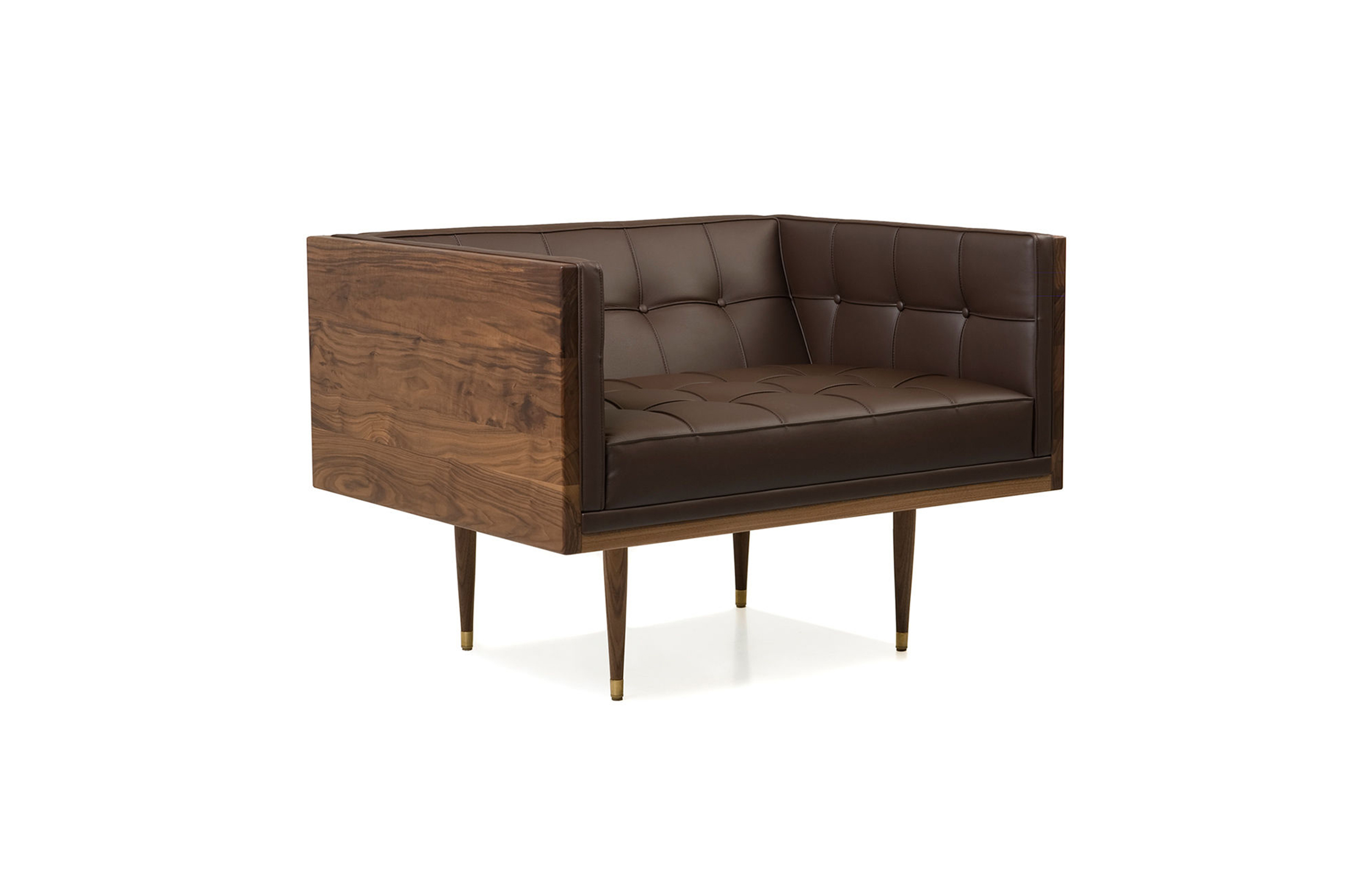 Box Armchair,inspired by the 1950's modernist movement,has the pure shape of a box.The inner face of the solid wood form offers refined comfort with crisp upholstery and classic tuft detailing. The four supporting legs appear to be impossibly slender,creating a stunning profile.Designed by Autoban and manufactured by De La Espada for the Autoban brand.