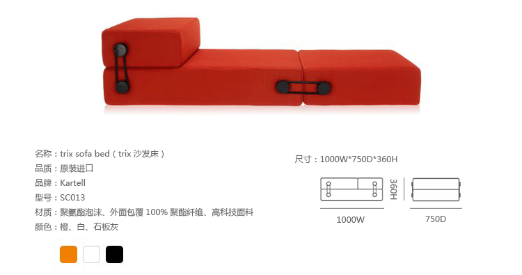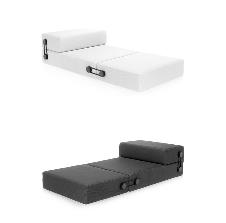 Trix Sofa Bed(Trix 沙发床)三个不同的元素组成的,通过弹性可随时转换和适应不同的用途,通过简单的旋转优雅系统连接。Trix 可以两人坐垫凳,舒适的床、 躺椅,或者扶手椅。Trix 是由可移动(折叠)的3D 图案技术面料泡沫聚氨脂软垫制成的。