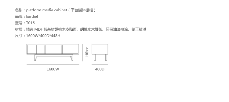 platform media cabinet(平台媒体橱柜)有着迷人的中世纪设计风格和当代形式巧妙融合,媒体橱柜主体平台由三组抽屉组成,中间的抽屉是敞开的,两侧的是滑动伸拉抽屉。在20世纪50年代末,60年代初, Finn Juhl和 Arne Vodder 最先尝试胶木和天然木的组合运用,并流行至今。这是大胆的创新,他们结合传统的新鲜的新兴技术与现代主义的概念。他们通过这些色彩绚烂的产品所实现的是令人印象深刻的比例的平衡。制作采用精选MDF板基材胡桃木或水曲柳木皮贴面、实木脚架、环保油漆喷涂,做工精湛,品质一流。