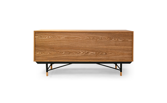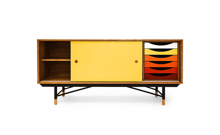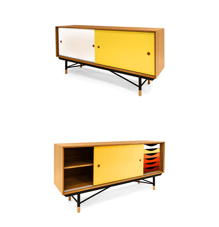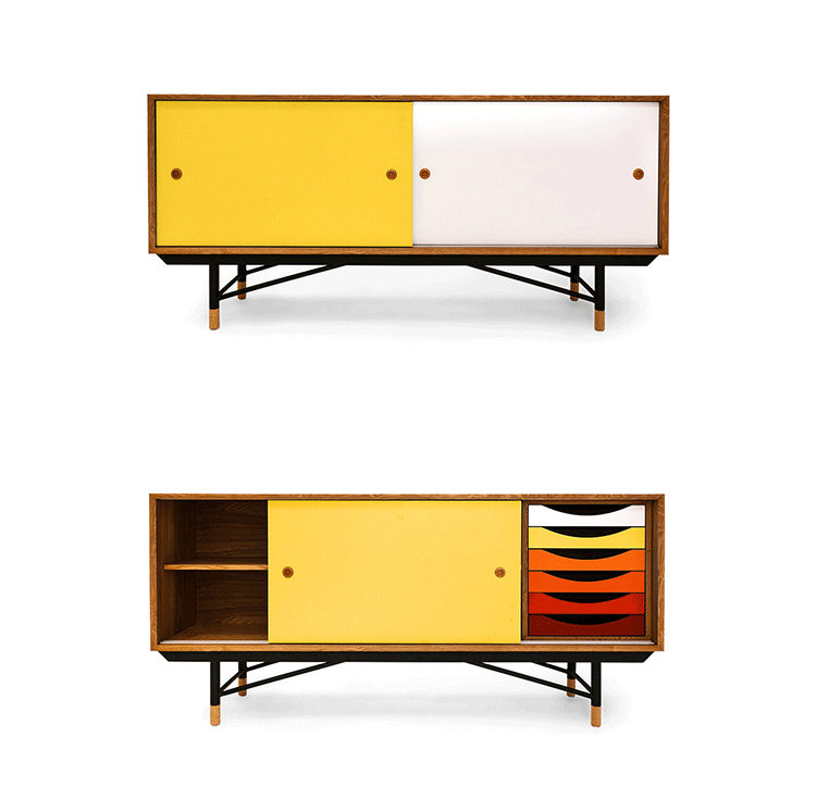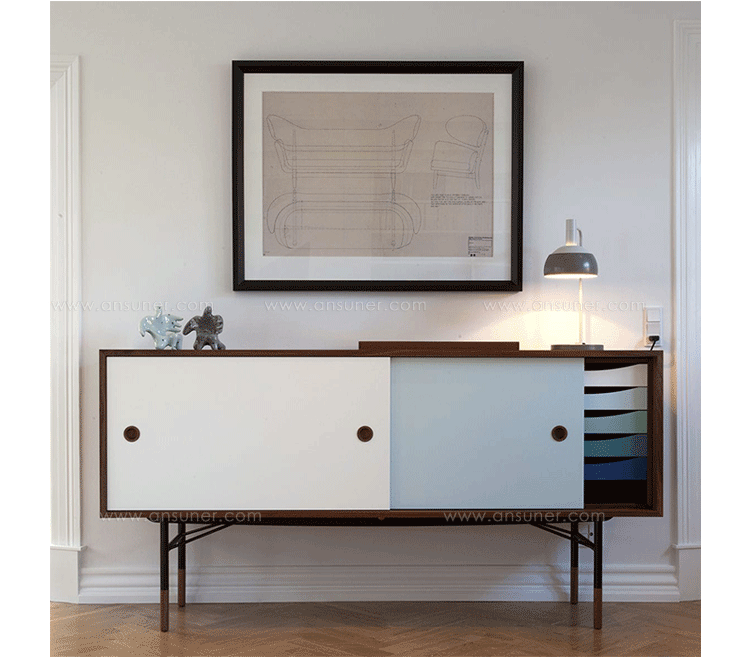 color theory sideboard(色彩理论餐边柜)是设计师Juhl Finn设计的,Kardiel公司制作的经典实木家具,1940年,他设计的第一张座椅、也是最经典的作品——《鹈鹕椅》(Pelican Chair),目前为纽约现代艺术博物馆 MOMA 所珍藏。彩色的滑动门与托盘餐具柜是1955年由Juhl Finn为BOVIRKE设计的。)是Kardiel公司制作的经典实木家具。复古但永不过时的木炭是和橙色,结合美国核桃开创了20中世纪六十年代中现代主义的时代。在现代主义的存储家具上, Finn Juhl和 Arne Vodder 最先尝试胶木和天然木的组合运用。这是大胆的创新,他们结合传统的新鲜的新兴技术与现代主义的概念。他们通过这些色彩绚烂的产品所实现的是令人印象深刻的比例的平衡。制作采用精选MDF板基材胡桃木皮或水曲柳贴面、五金脚架、环保油漆喷涂、做工精湛。颜色元素的使用反映了他迷恋歌德的著名彩色圈,颜色处于和谐的凝聚力。