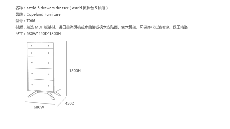 astrid 5 drawers dresser(阿斯特丽德5抽梳妆台)是Copeland Furniture公司astrid实木梳妆台系列之一,宽大的八字形脚架非常吸引人注目,制作并非易事,它其实是一个大工程,同时能引发无限期望和激情,5个平滑抽屉,可以给与提供许多存储空间。制作采用精选MDF板基材、进口美洲胡桃或水曲柳或枫木皮贴面、实木脚架、环保净味油漆喷涂、做工精湛。