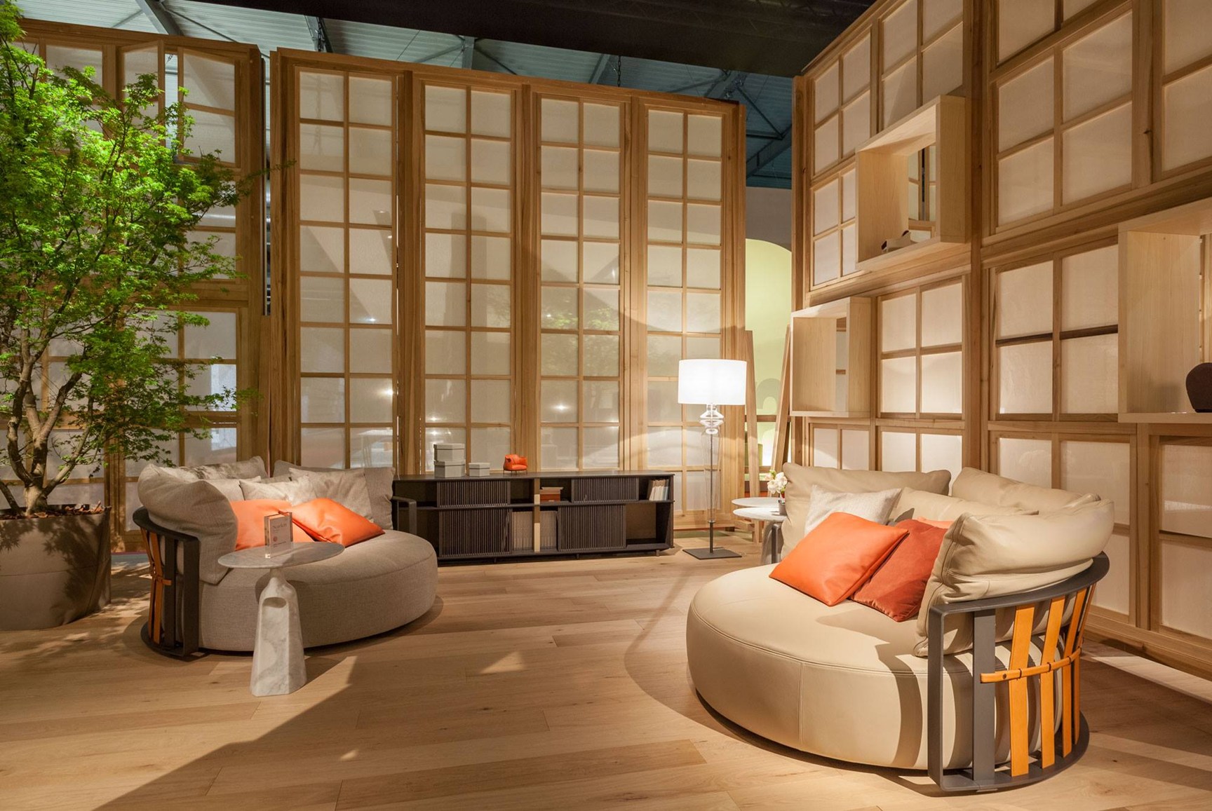 一系列的薄垂直木制棒光网格形式,无形的水平轨道上运行从上到下。 每个网格可以根据需要创建不同的序列