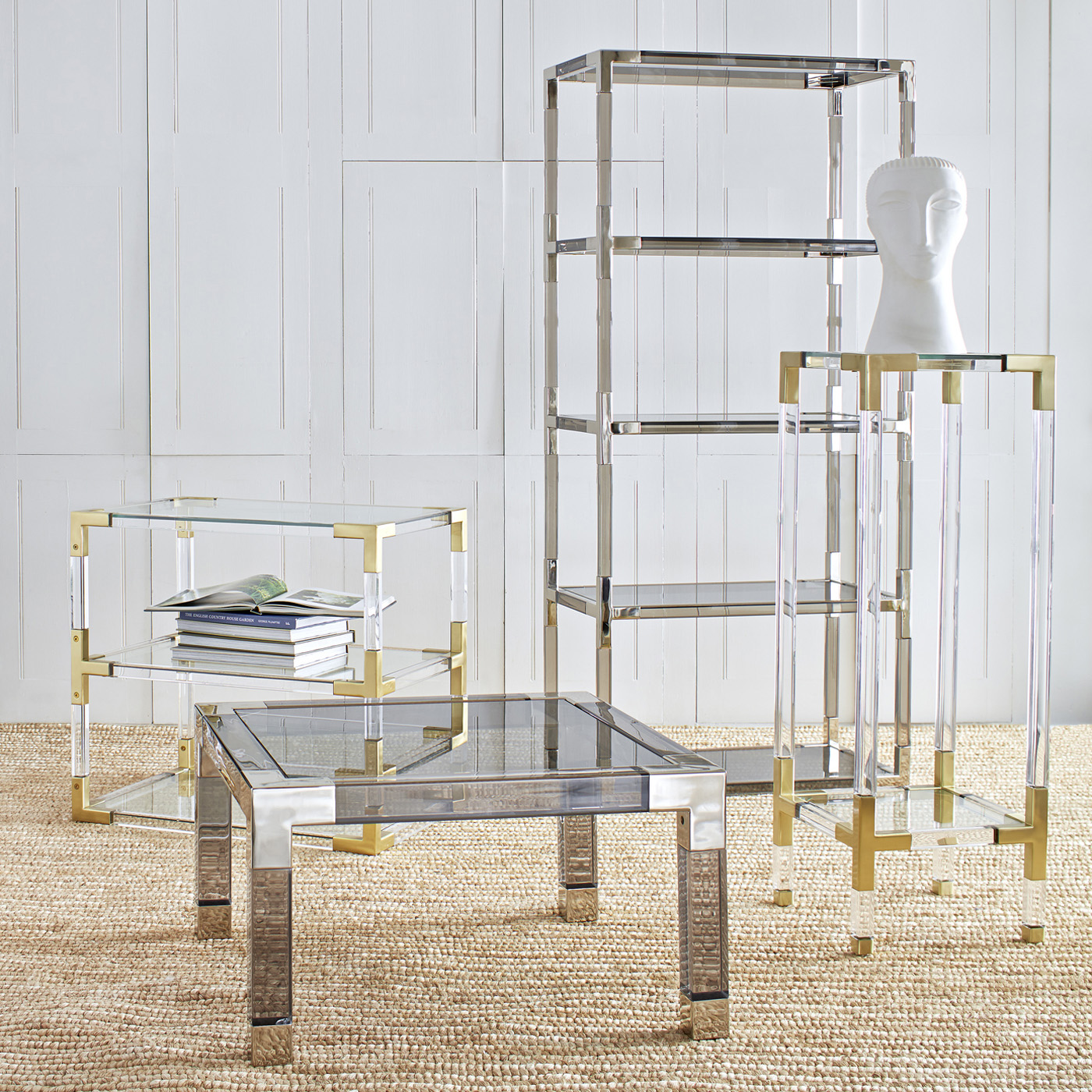 从luxe透明丙烯酸与拉丝黄铜或抛光镍口音,或穆迪烟丙烯酸与抛光镍装饰。为书籍或展示你最喜欢的作品而举行的聚会。