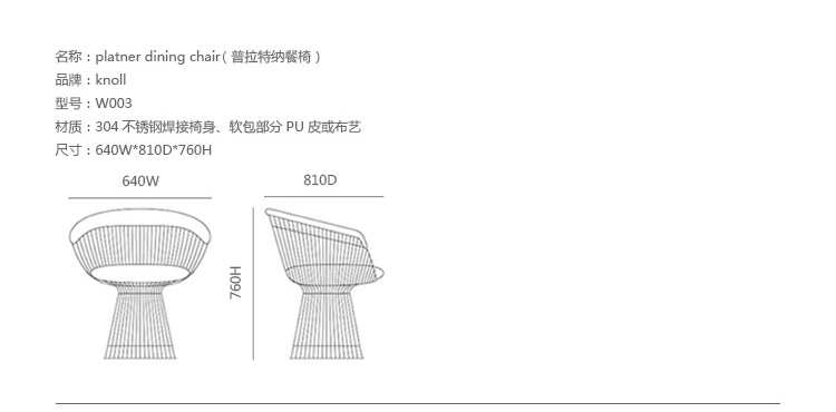 Platner Chair 的結構框架有以明亮的鍍鎳透明漆包覆鋼線和上漆青銅兩種材質選擇,以垂直金屬線材為主體支架,椅身包括一體成型的壓模玻璃纖維外殼和泡沫軟墊,軟墊以魔術粘附著椅座。