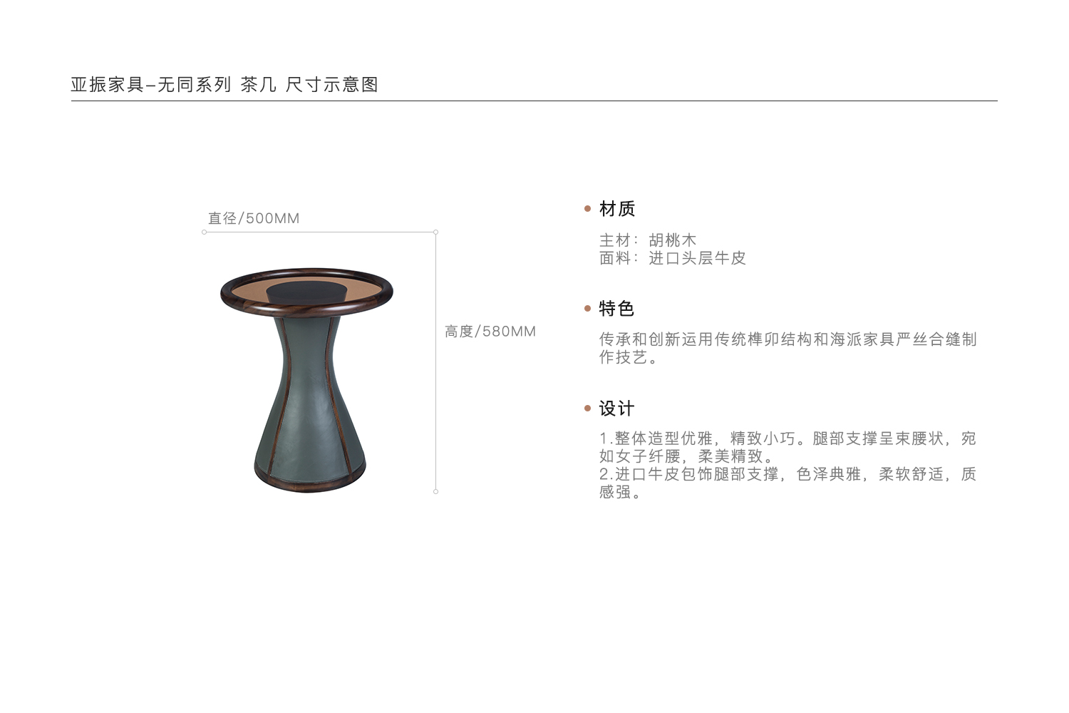 1.整体造型优雅,精致小巧。腿部支撑呈束腰状,宛如女子纤腰,柔美精致。 2.进口牛皮包饰腿部支撑,色泽典雅,柔软舒适,质感强。