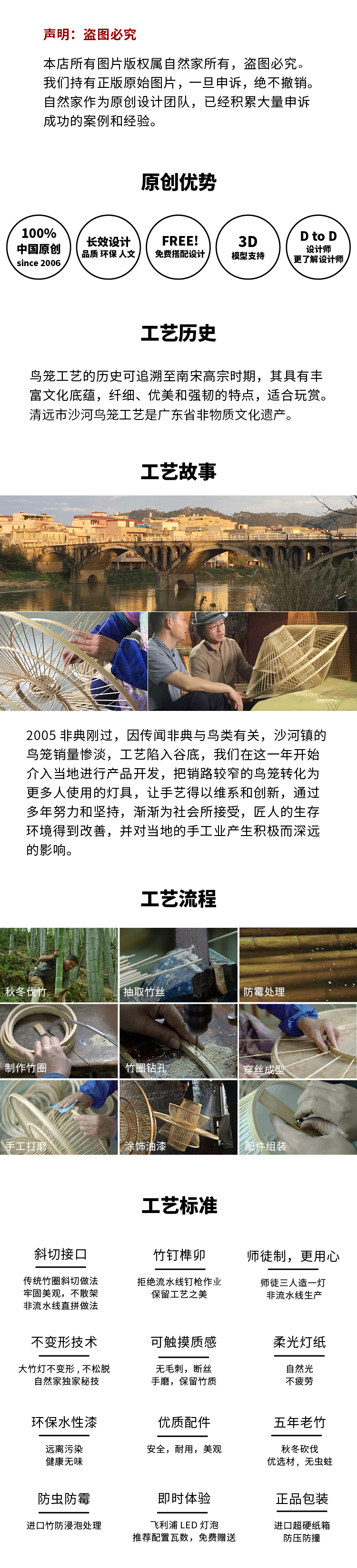 在灯体的黄金比例处加圈的设计,在让灯体更坚固耐用。同时塑造了饱满而微妙的 曲线形体,安静优雅的造型,散发出远古的韵味。鼓灯工艺的历史可追溯至南宋高 宗时期,其具有丰富文化底蕴,纤细、优美和强韧的特点,适合玩赏。清远市沙河 鼓灯工艺是广东省非物质文化遗产。