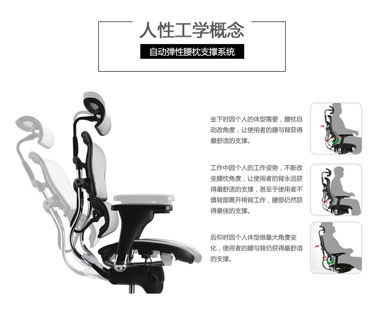 自动弹性腰枕支撑系统,无论是在坐下时、工作中、或者后仰时,都能让使用者的腰和背获得最舒适的支撑;