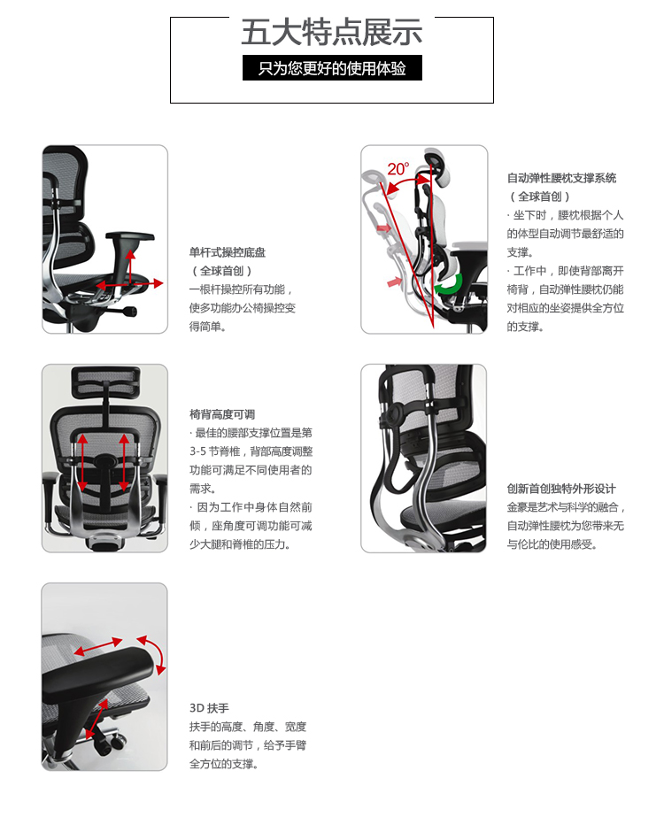 金豪系列采用完全性多功能调整设计,从椅背、扶手可进行全方位的调整;