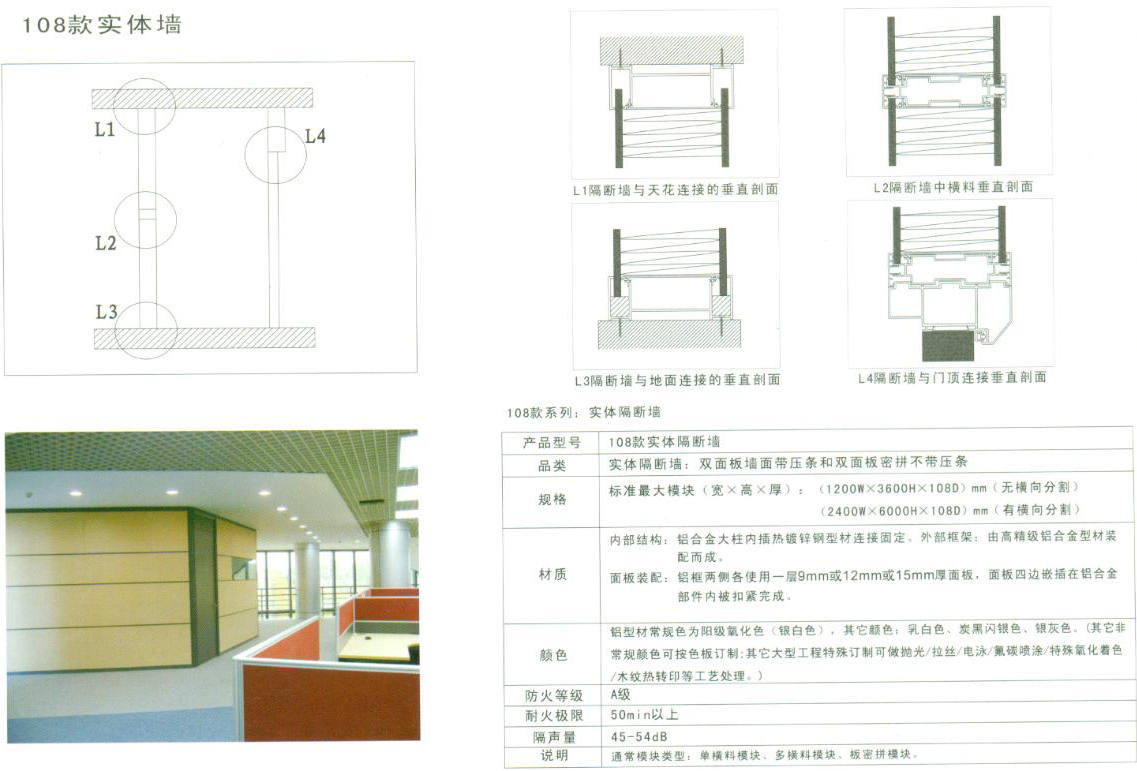 108款高隔断,厚度为108mm,它又分为108款双玻隔断和108款双面隔断,是目前东方华奥家具主推产品。面板跨度最大可达2400mm,玻璃跨度最大可达3200mm,高度可以做到6000mm,是东方华奥家具隔断墙系列里跨度分割和高度分割最大的一个系列。
