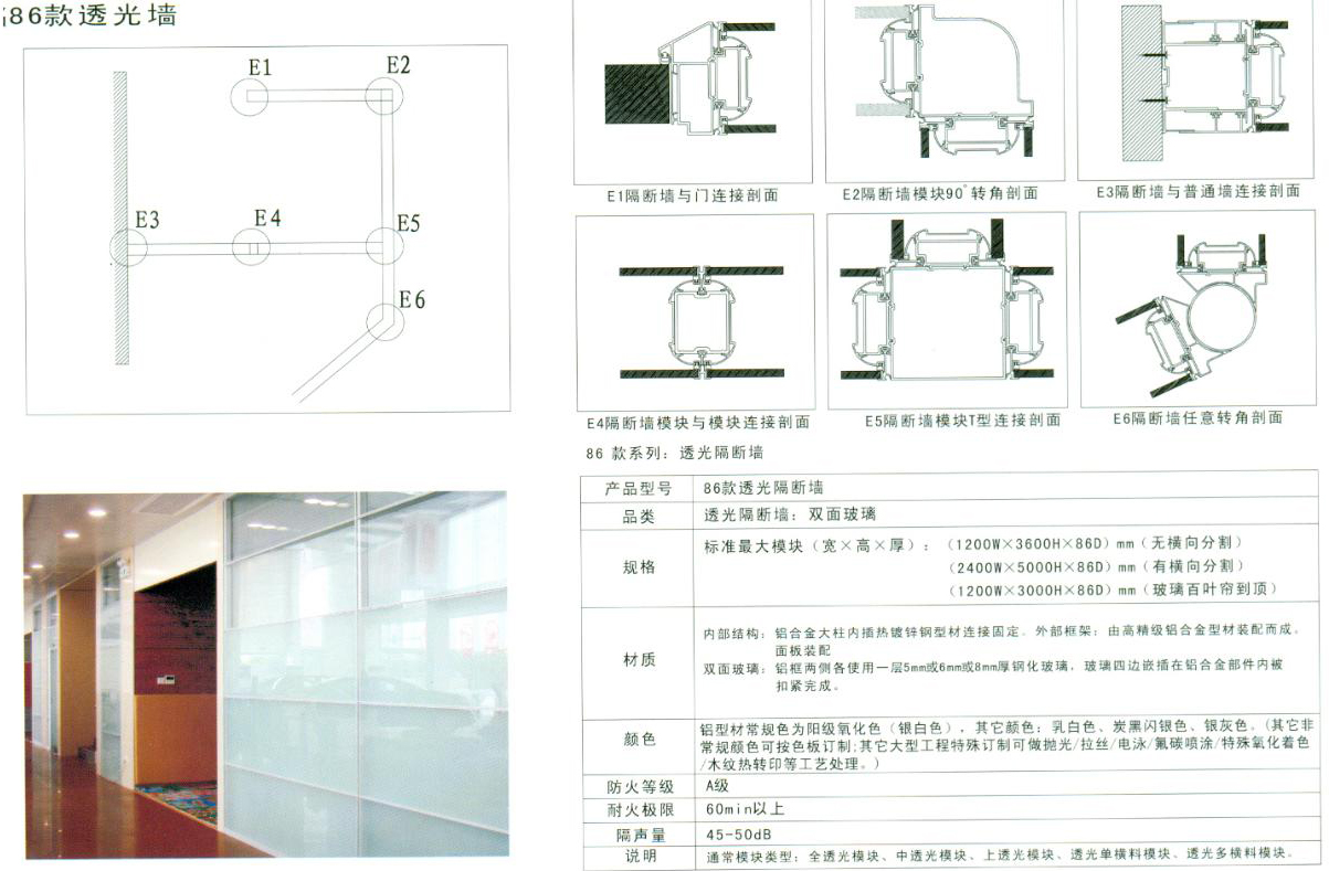 86高隔断是最为成熟的产品,已经做过很多工程案例,深得广大客户认同和喜爱,它的任意拆装,灵活多变地空间划分组合,自由吊挂随意的材质搭配,把办公空间的艺术之美演绎的淋淋尽致。 铝框中间横向压条为17mm,竖向压条为13mm,上下槽为65mm,左右壁槽为:65mm,侧柱为20mm。