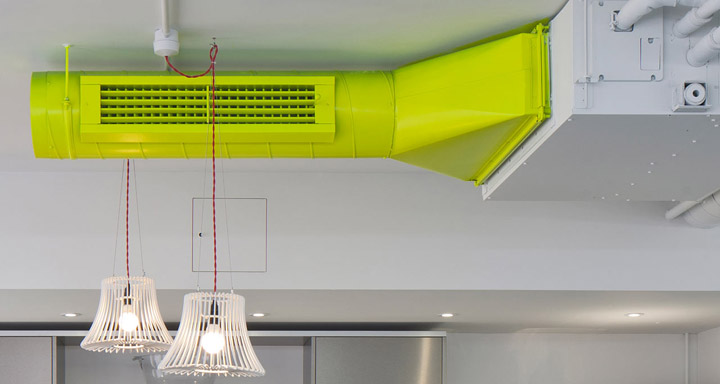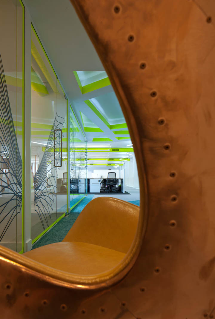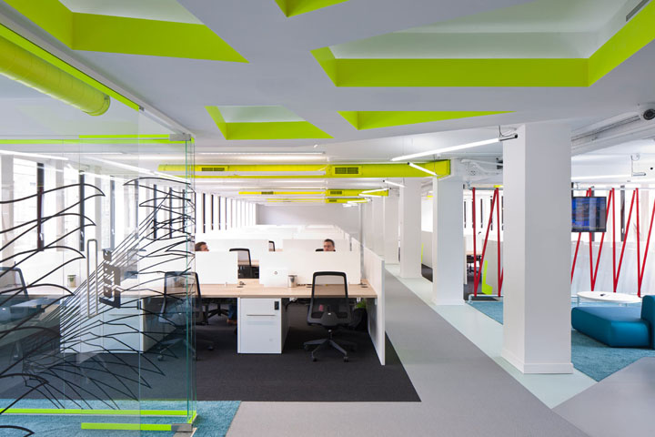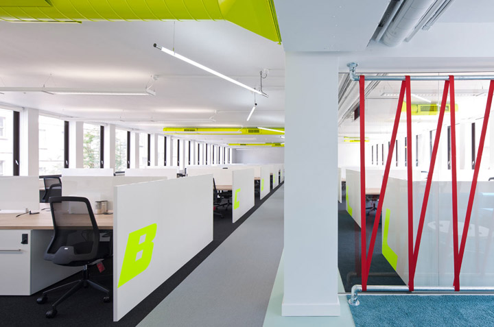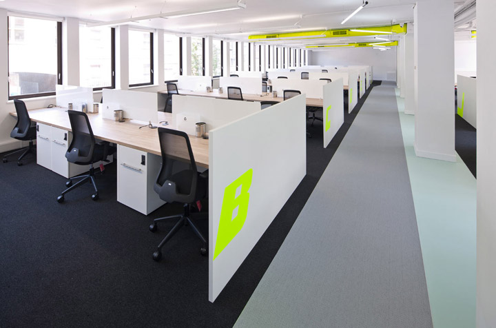 裸露的顶面管道喷涂以同样的黄色;每一组工位都以醒目的霓虹黄色字母加以标识。空间的其它色彩以中性色加以调和,以免跳跃的霓虹黄色太过强烈刺激。