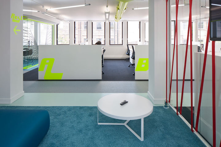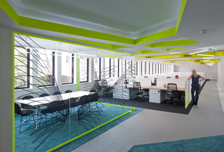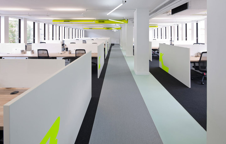 设计以白色为空间主调,加入充满活力的颜色,如霓虹黄色顶面线槽、以及柔软的绿松石色地毯点缀在灰与黑色地毯间。