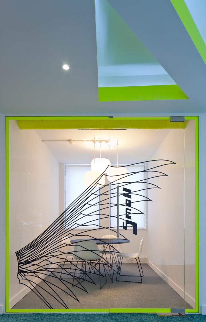 最有趣的设计当属会议室的玻璃隔墙,上面绘制了一系列的天使(Angel)翅膀图形,为密集的办公区增添了丰富的视觉效果。