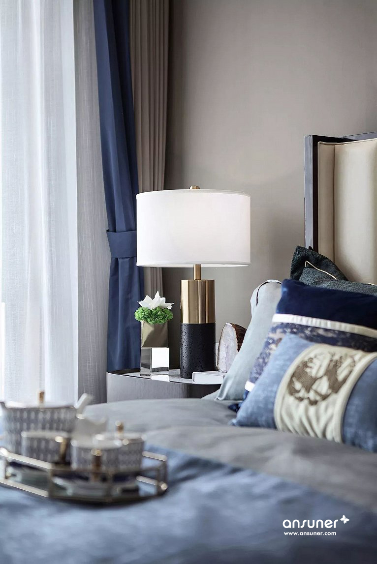 主卧组合了丝绒面料、马毛地毯、精致水晶、尊贵皮质等现代元素,呈现出品质生活的现代追求。设计灵感来自被誉为不夜城的“New York City ”,并巧妙介入都会元素,塑造出让人迷恋的简洁、奢华与雅致,让我们仿若置身纽约曼哈顿,沉浸在时尚优雅的都市氛围中,享受现代人心之向往的自由与洒脱。