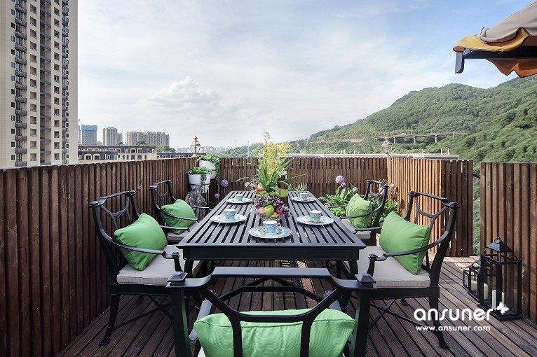 一个简约的露台,可接待亲友,可悠闲独坐,欣赏花草,感悟生活的美好,远处自然的蓝天、青山、绿水,尽收眼底。设计师以全木架构整个区域,自然质朴,将带有中式线性元素的黑色铁艺桌椅与之搭配,凸显简约低调的质感美。