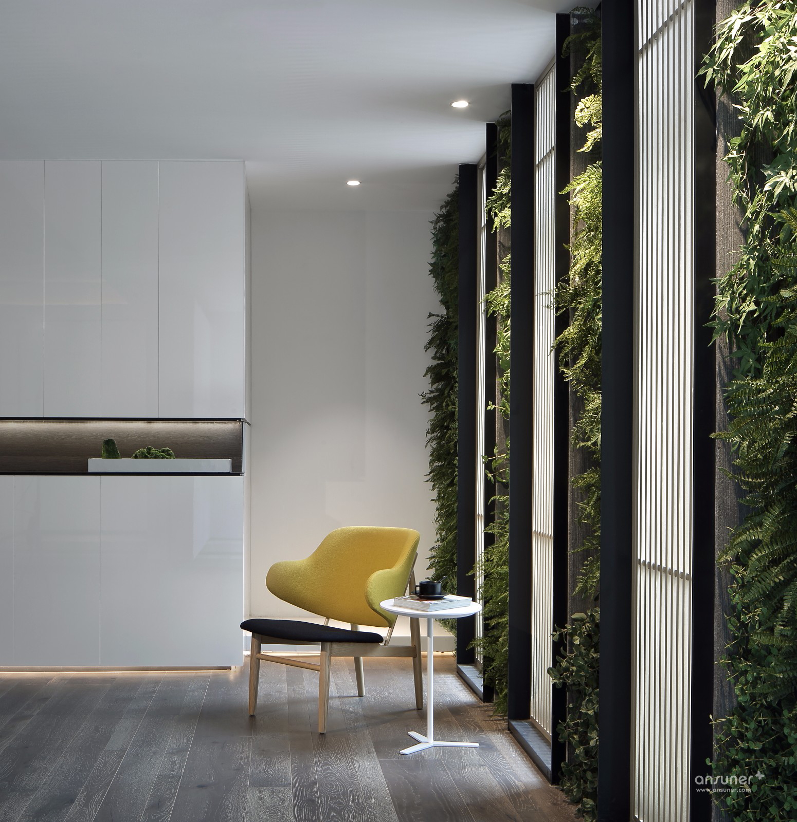 门厅接待区的视觉呈现,表述空间设计的构想初心。设计并未沿用对称、均衡的常用手法,而是以错位、悬拉的三面白墙,细分空间三重场域。