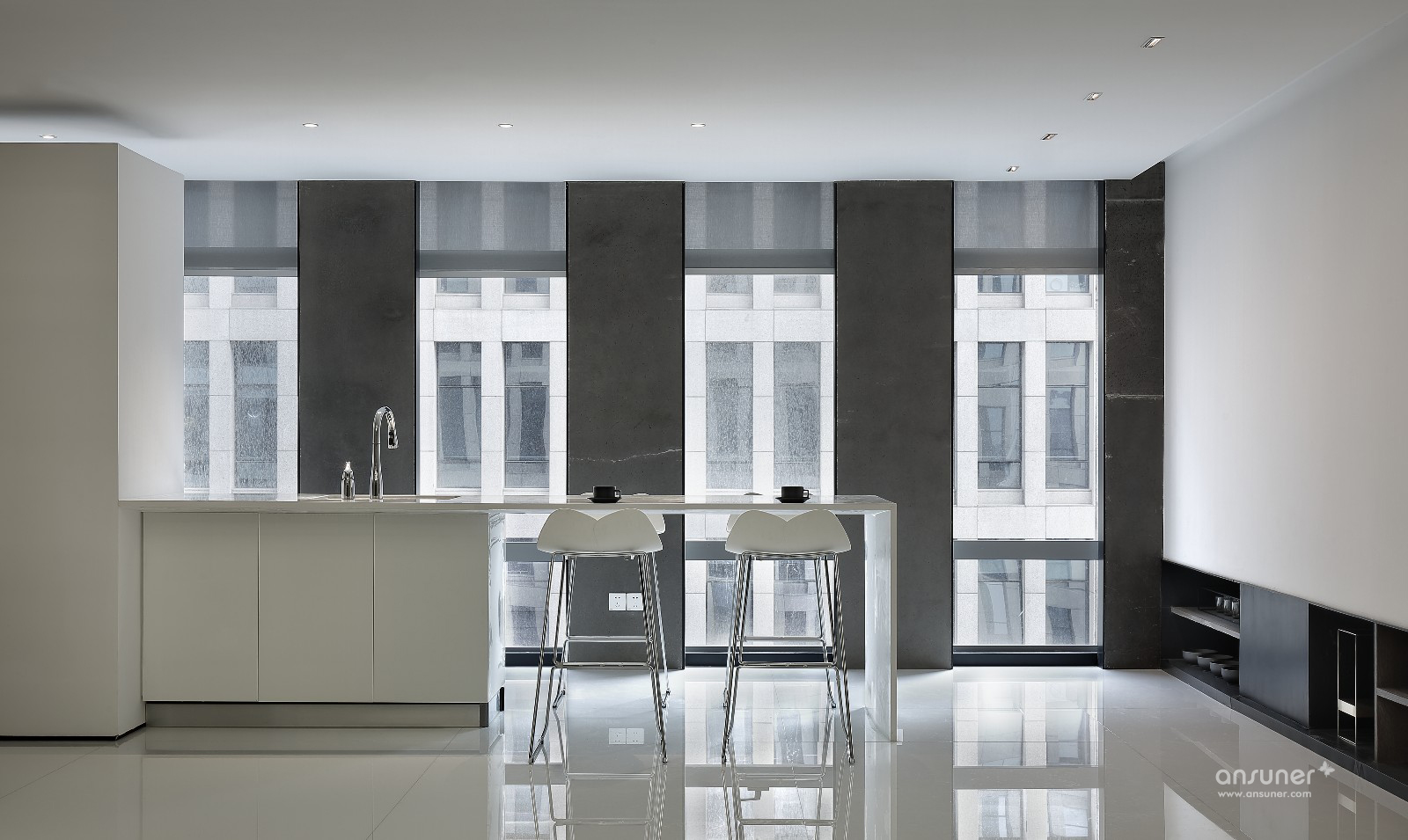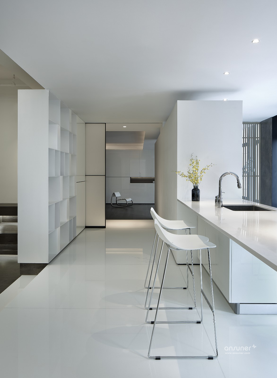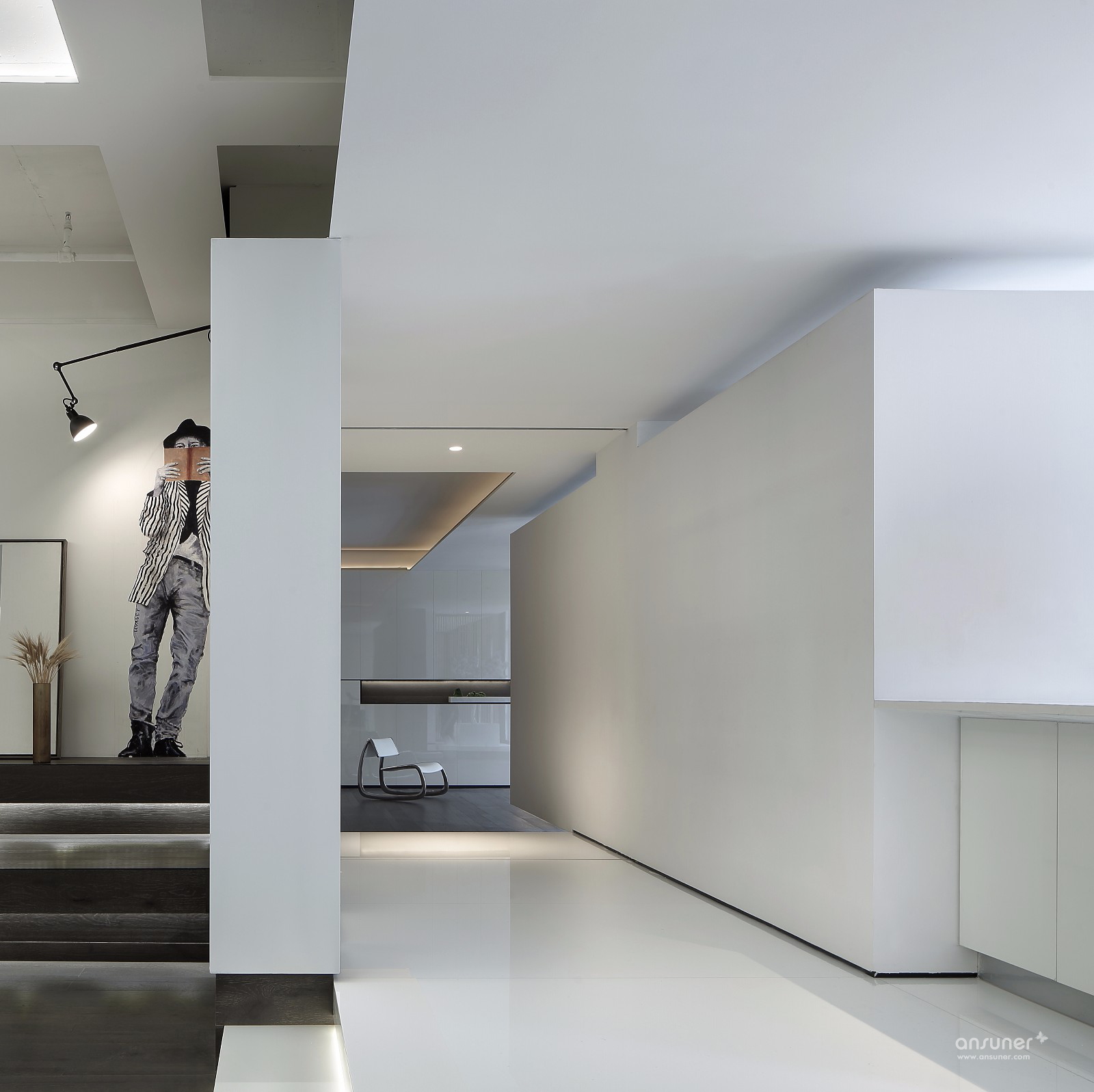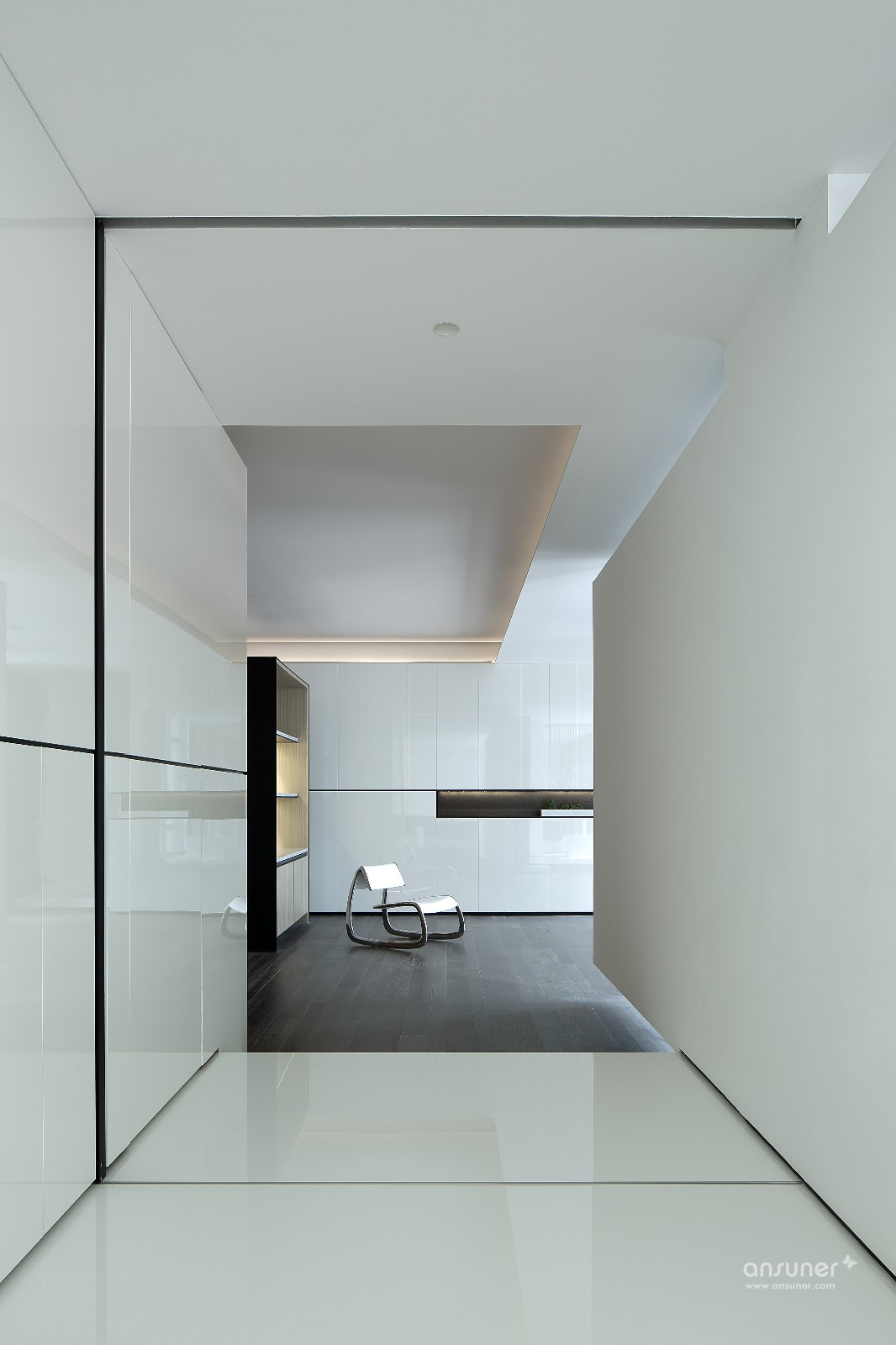 极简设计下,纯净的白色从顶面、墙面一直延伸到地面在单一色调中,以简明的线条,勾画出空间棱角。