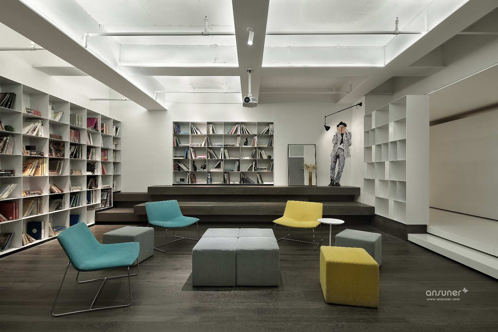 阅读区和餐台以两阶踏步错落分割,继续空间减法的原则,材质和色彩的表达,则更为丰富。在白色基调中,增加深灰色比例,同时融入布艺肌理的家具;小巧而精致的金属、陶器摆件,增加阅读空间的闲适意趣