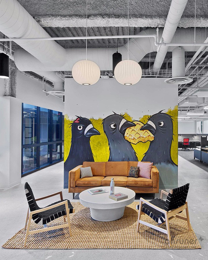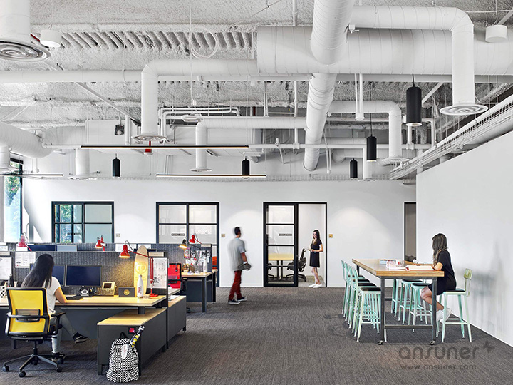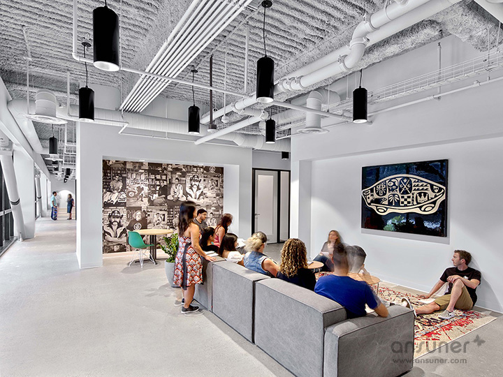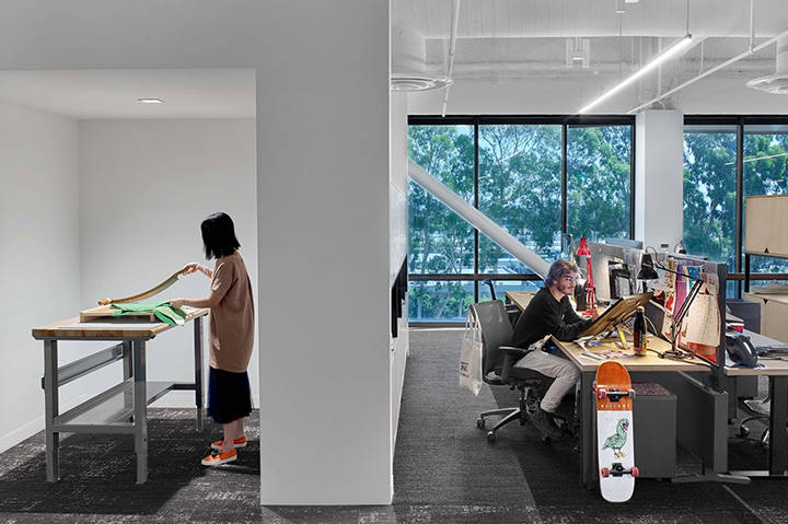 室内特别设计成混凝土水泥地面,鼓励大家踩着滑板在工作区之间自由穿梭。以开放式协作型设计理念塑造的工作环境,培养和促进积极的工作方式、以及协作和创新的工作文化。