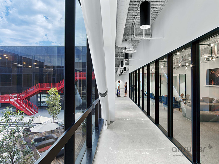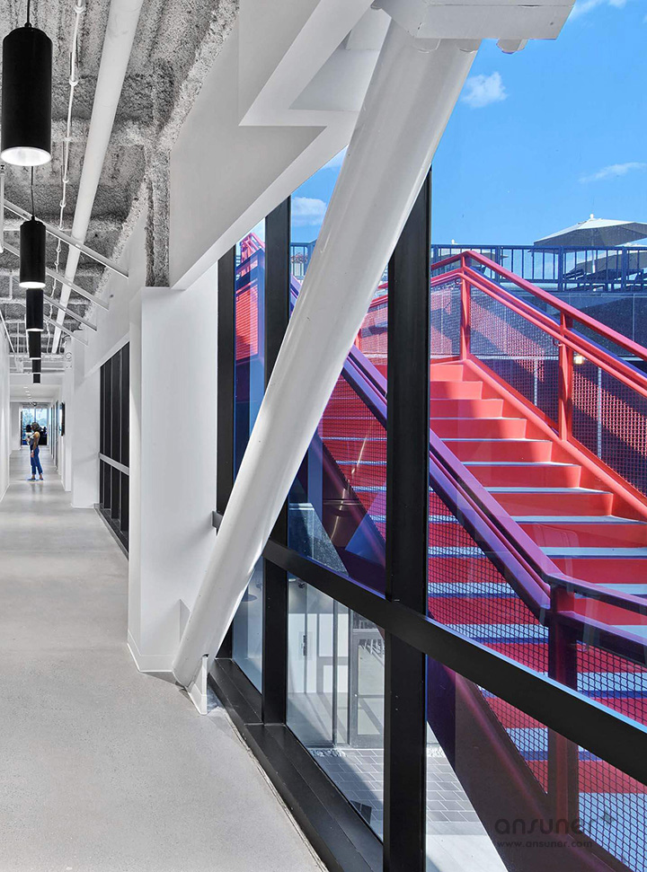 为了增强整体的社区凝聚感,每个楼层都围绕中庭建立一道环形公共走廊,并沿着走道布局一系列休闲会议空间、有趣的座位区,这样每位员工都可以从各个角度欣赏中庭美景。环形走廊让员工或访客在漫步于整个建筑时不会干扰到其他人的工作。