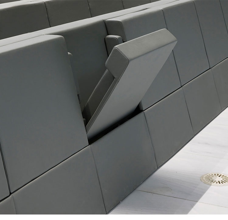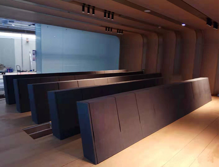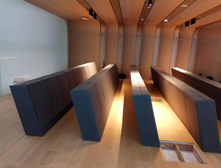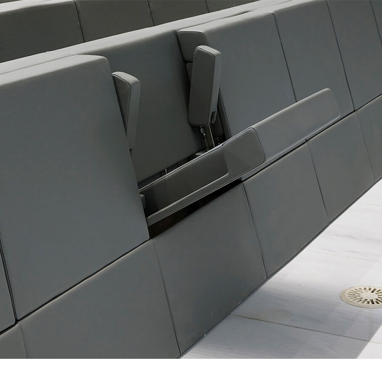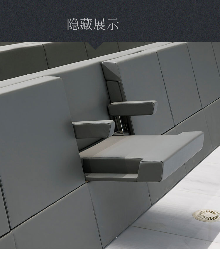 1. 椅背:采用进海绵原料+"S"型弹簧钢架经模具冷发泡一体成型,外型按人体工程学原理设计,坐感舒适。整个海绵弹性高,无异味,甲醛释放量控制标准达到国际先进水平。 2. 椅座:采用海绵原料+"S"型弹簧钢架+中纤板经模具冷发泡一体成型,外型按人体工程学原理设计,坐感舒适。整个海绵弹性高,无异味,甲醛释放量控制标准达到国际先进水平。 3. 背外板:采用中纤板制作成型,面覆优质PCV或布料。 4. 侧板:采用中纤板制作成型,面覆优质PCV或布料。 5. 站脚:采用钢管、钢板切割焊接成型,后经喷涂处理。 6. 扶手:采用海绵原料+五金件+木结构经模具冷发泡一体成型。 7. 面料:采用PVC或布料。 8. 回复机构:采用气缸缓起立回复机构,扶手、椅座连动回复节约通道,以保证回复无故障、无噪声、经久耐用。 9. 地爆螺丝:采用不锈钢内六角膨胀螺丝。